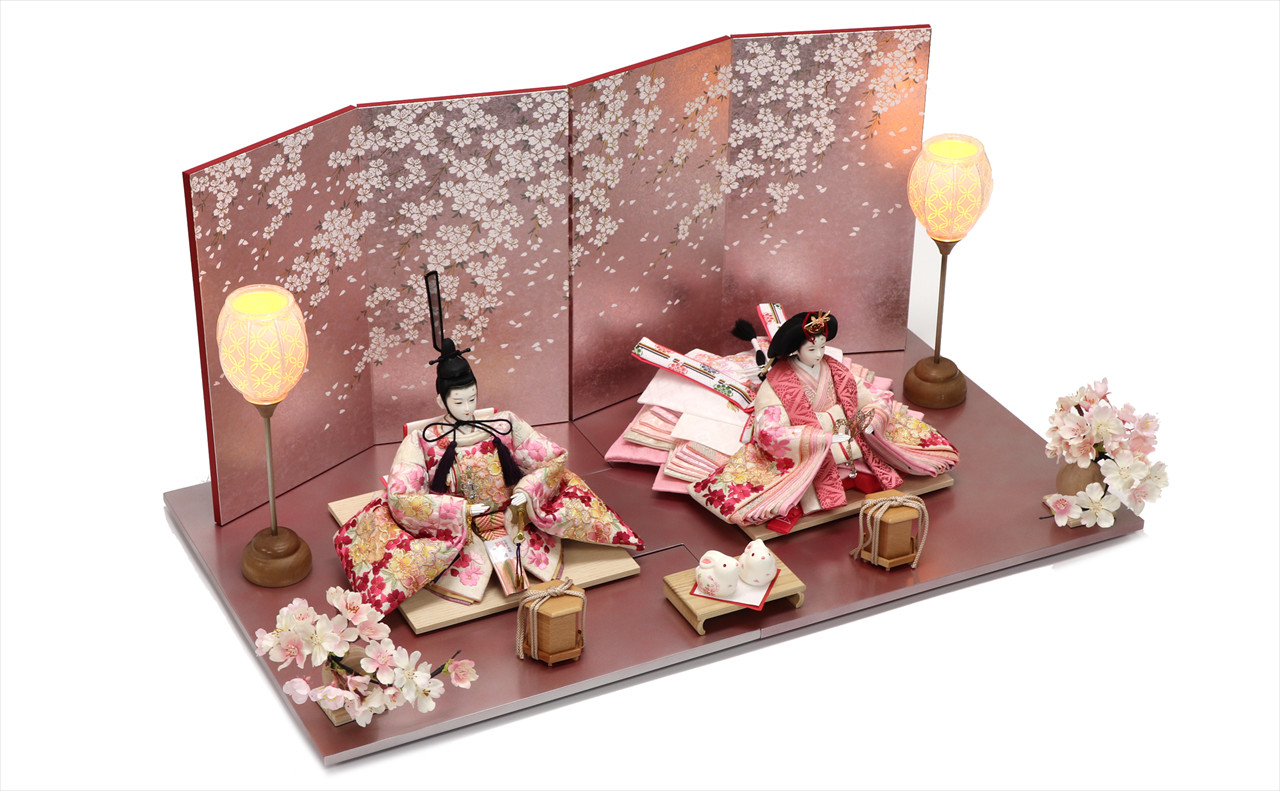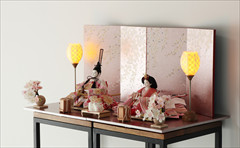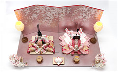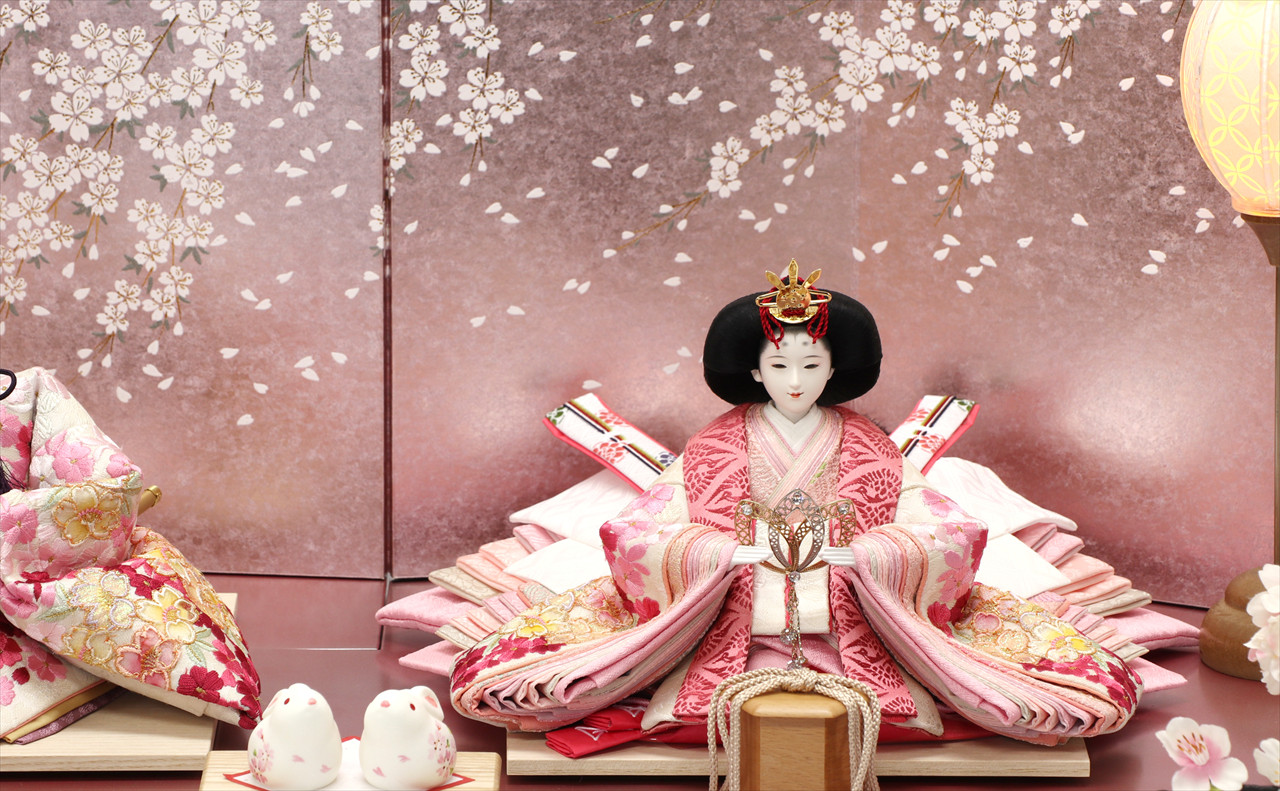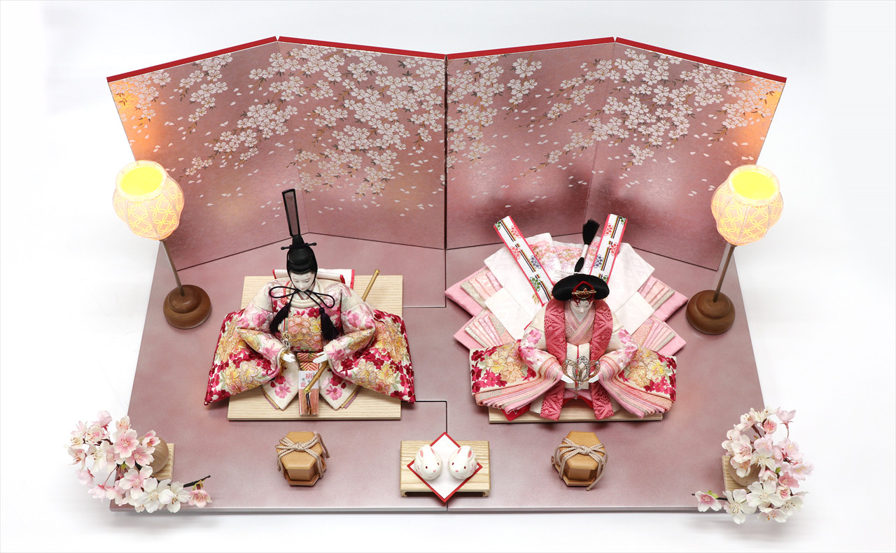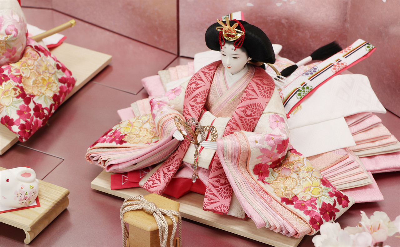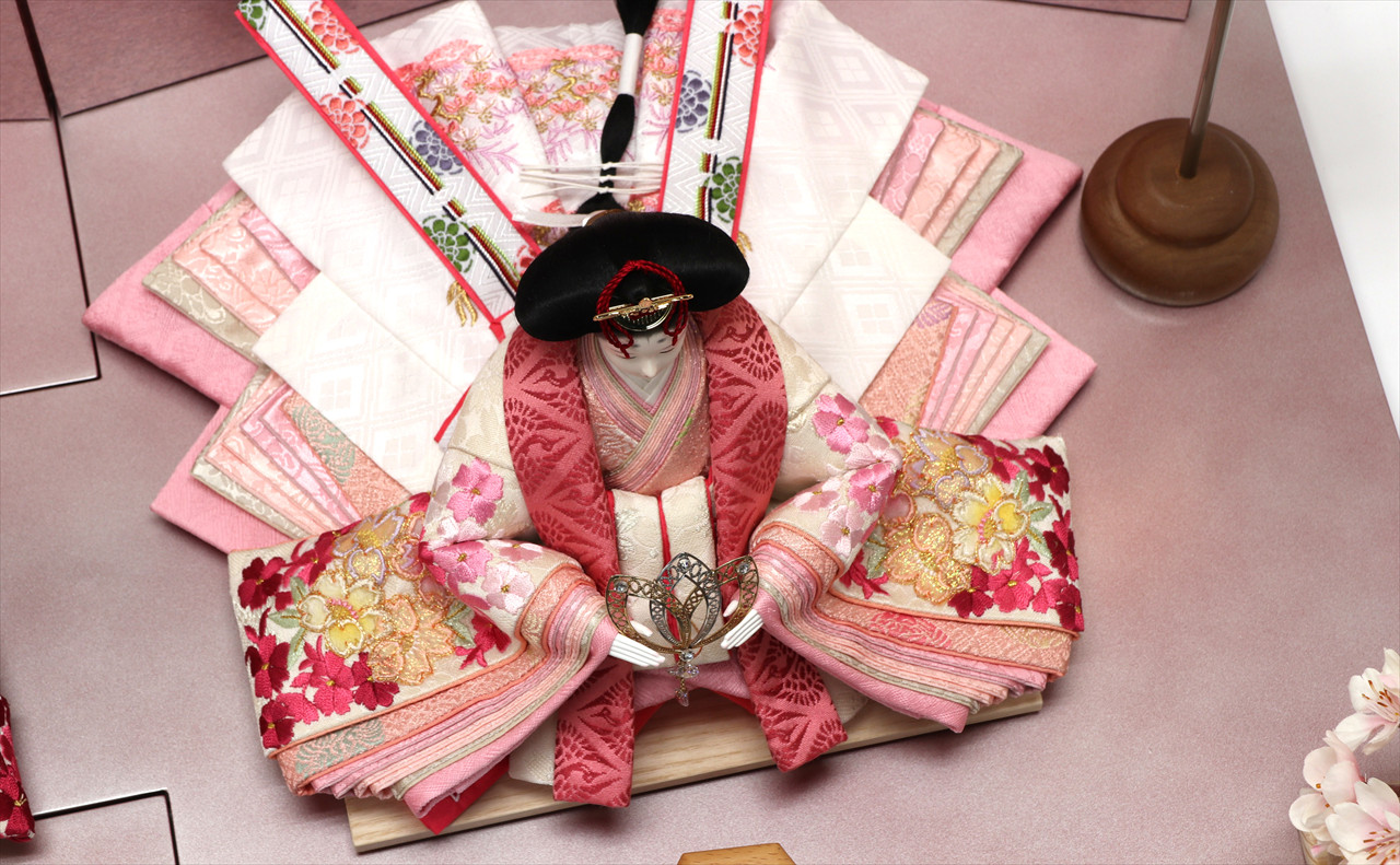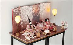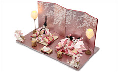 色は少ないほうが簡単・シンプルでセット組みがしやすいのですが、こちらの作品のように、あえて色を多く使うためには様々な工夫やアイデアで雛人形を引き立てる空間を作ります。