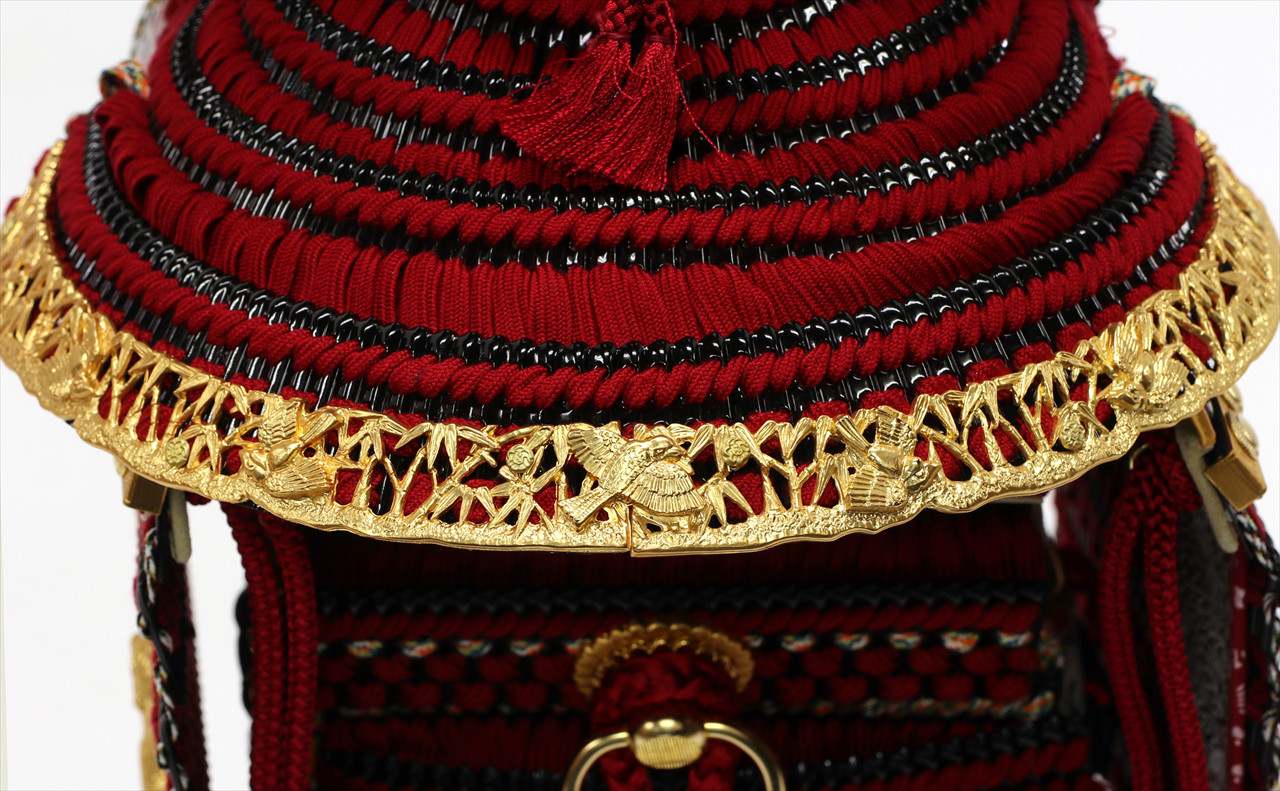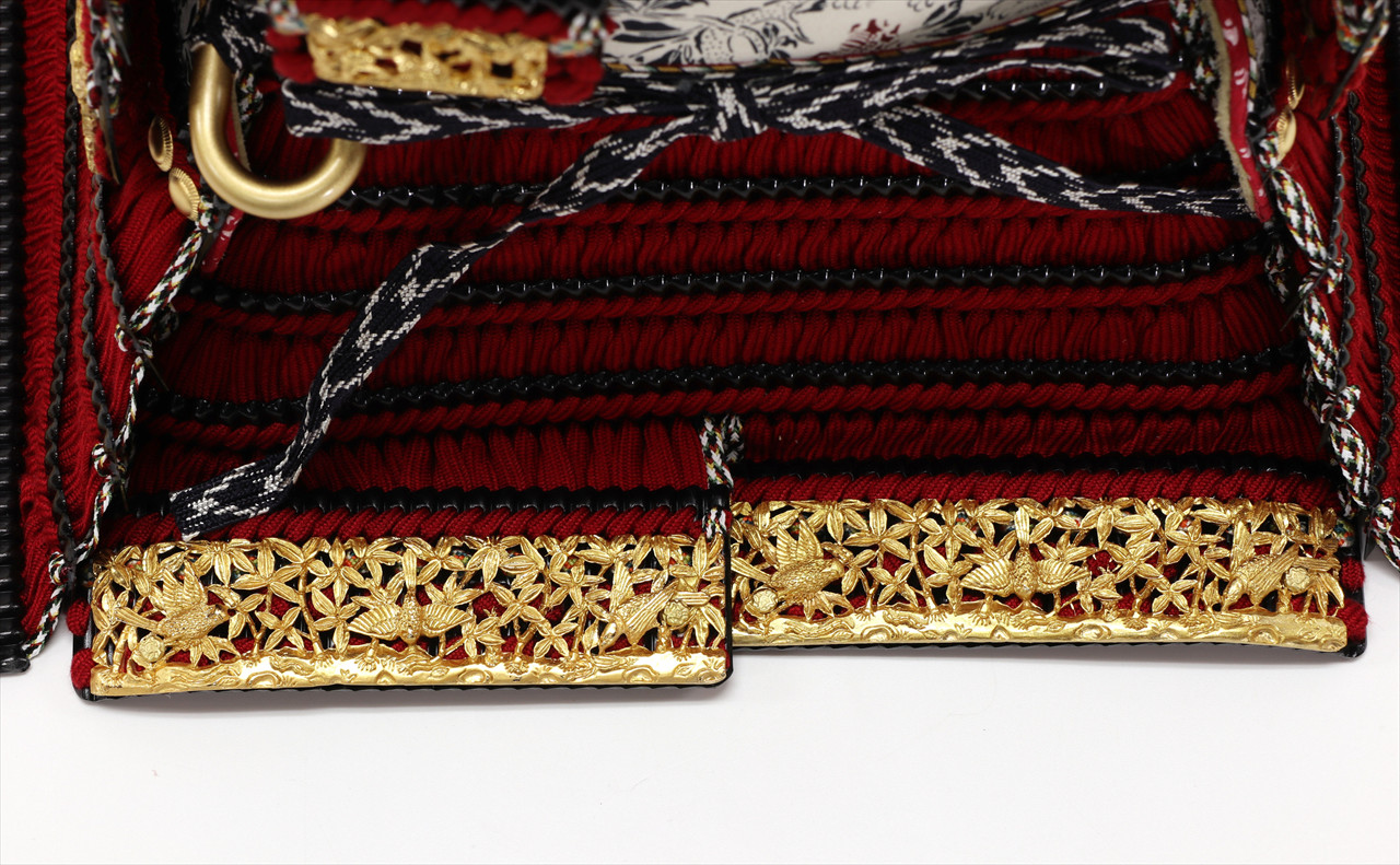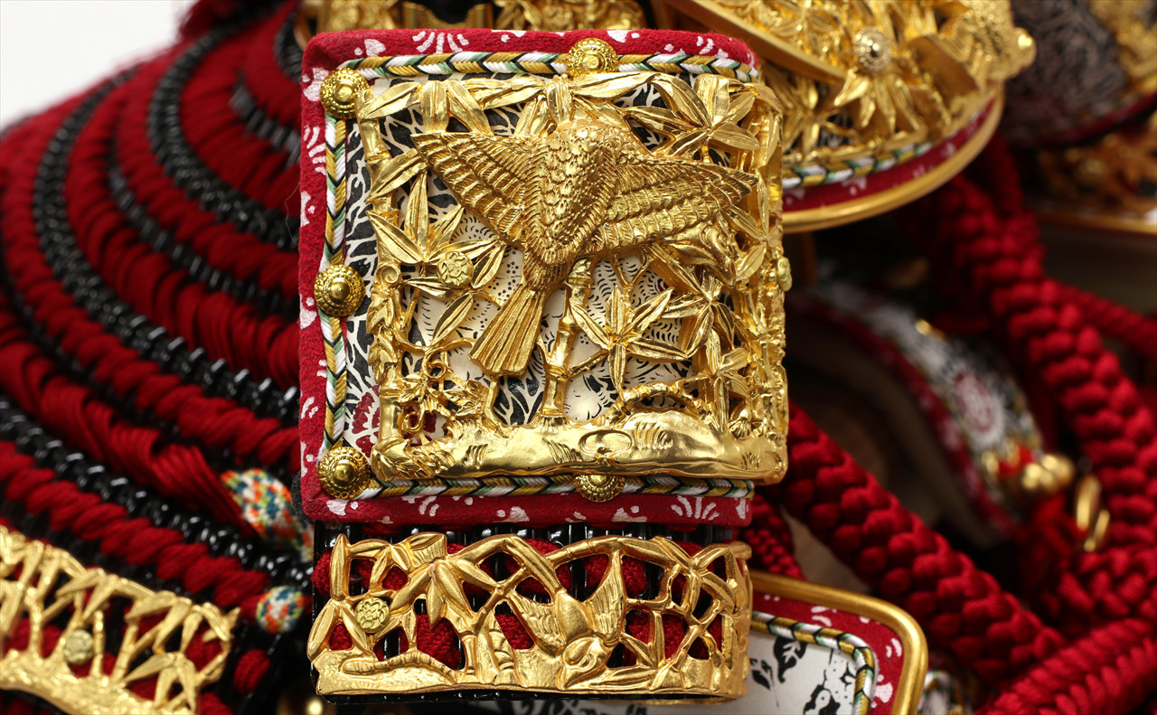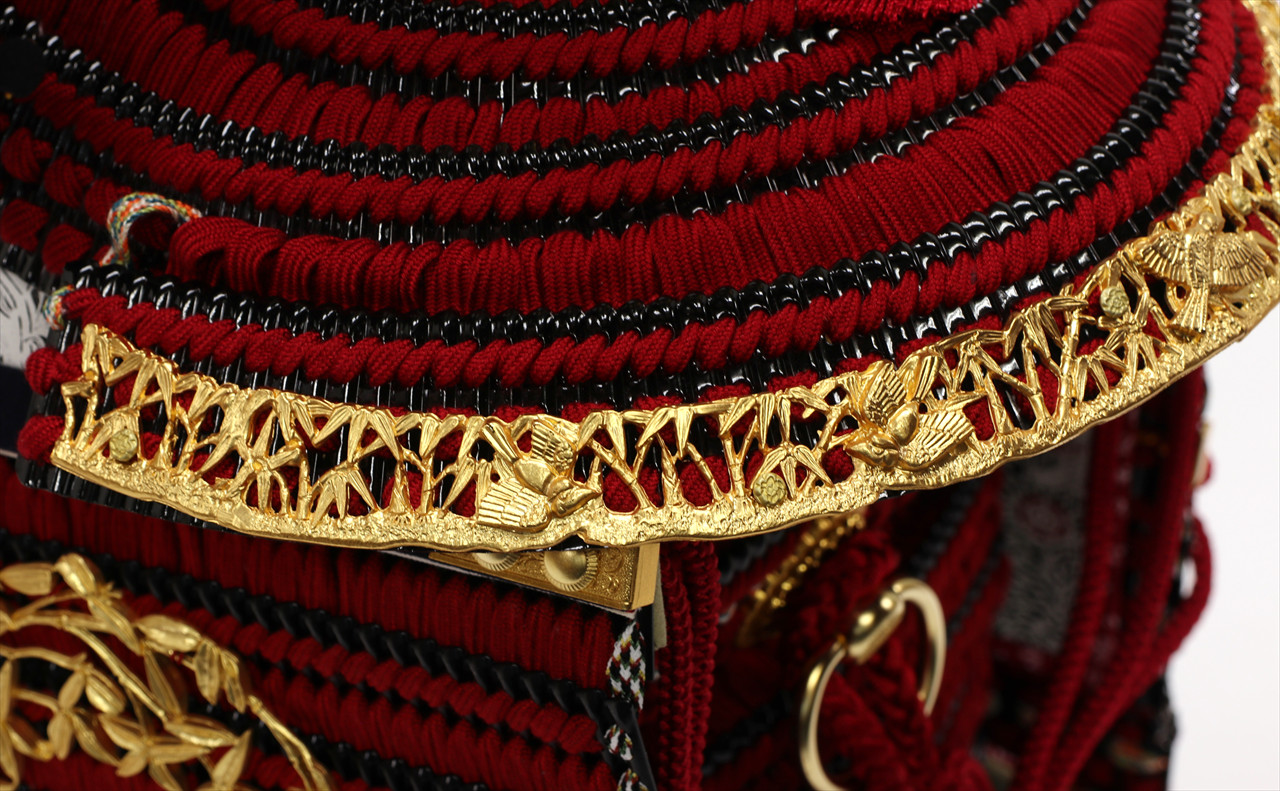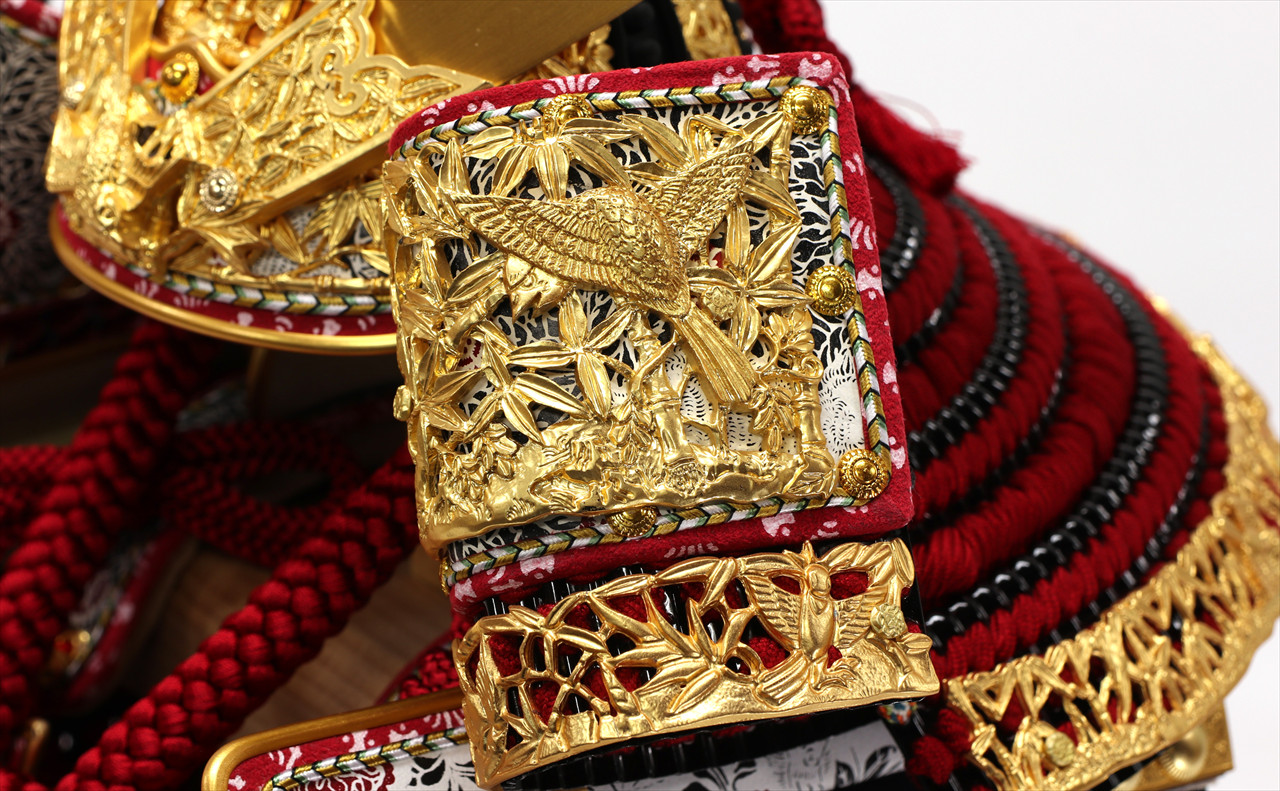 兜や鎧全身にある金物細工には隙間なく金箔押しが施され、無数の雀が戯れる様子が表現されています。