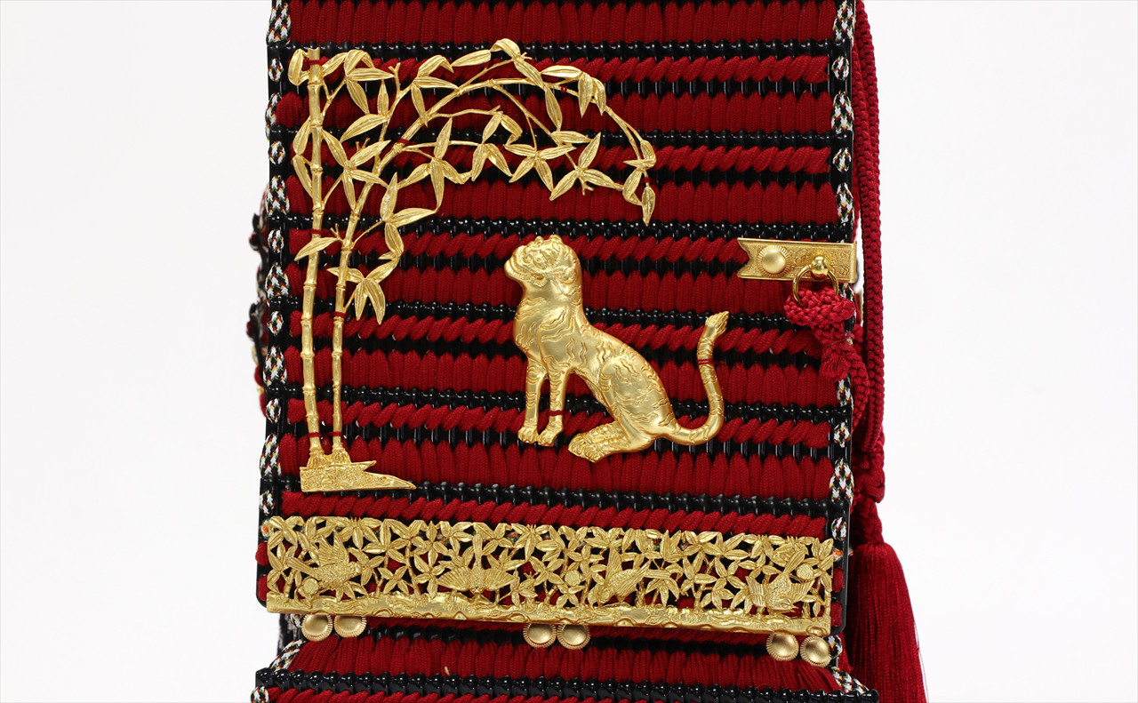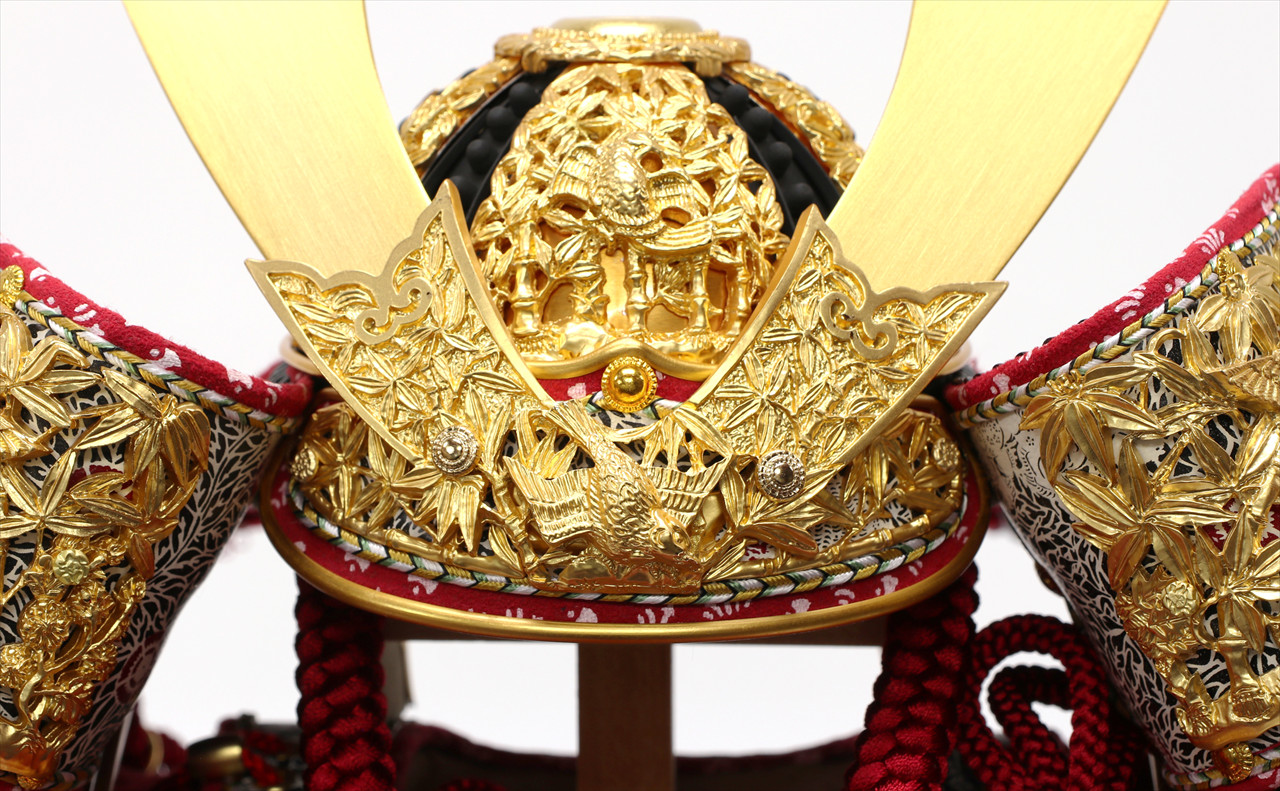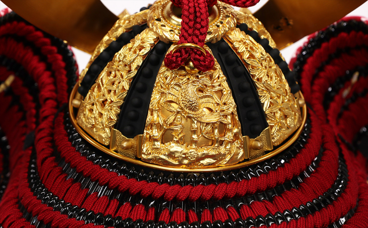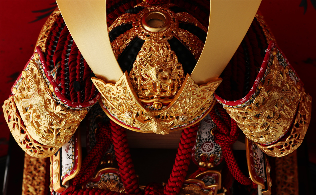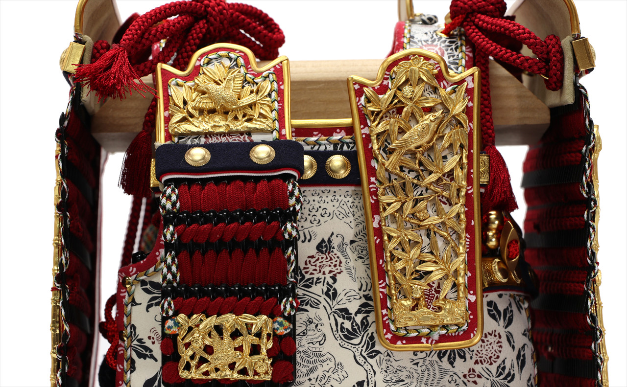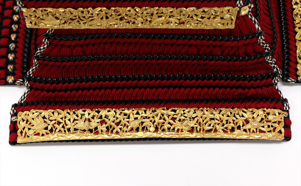 兜や鎧全身にある金物細工には隙間なく金箔押しが施され、無数の雀が戯れる様子が表現されています。