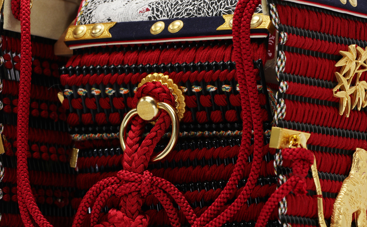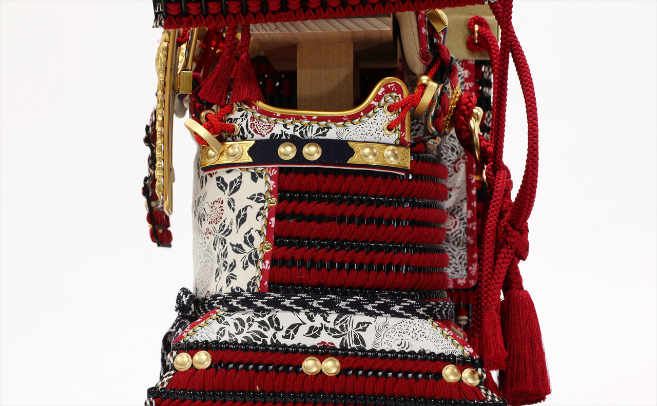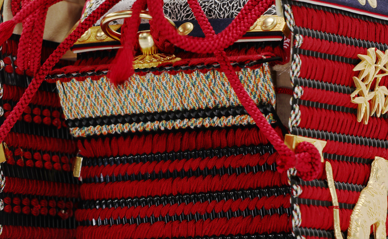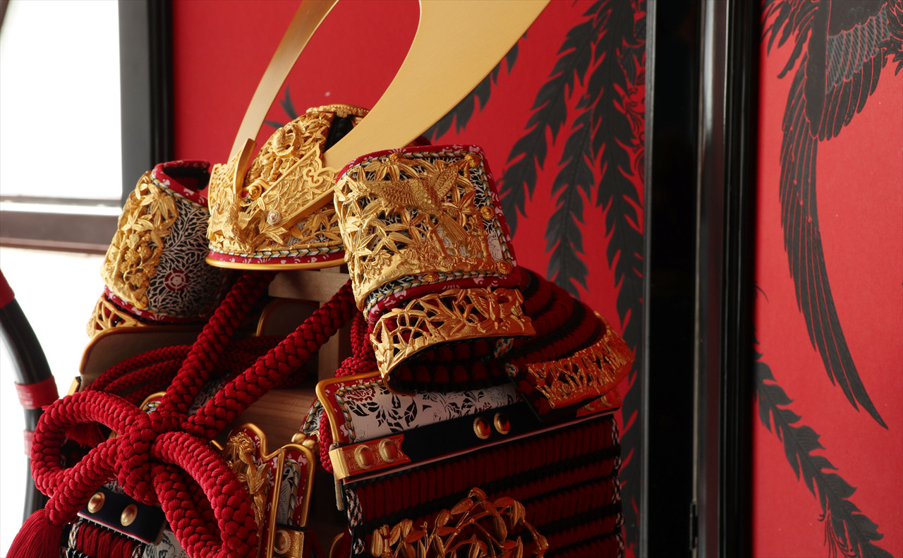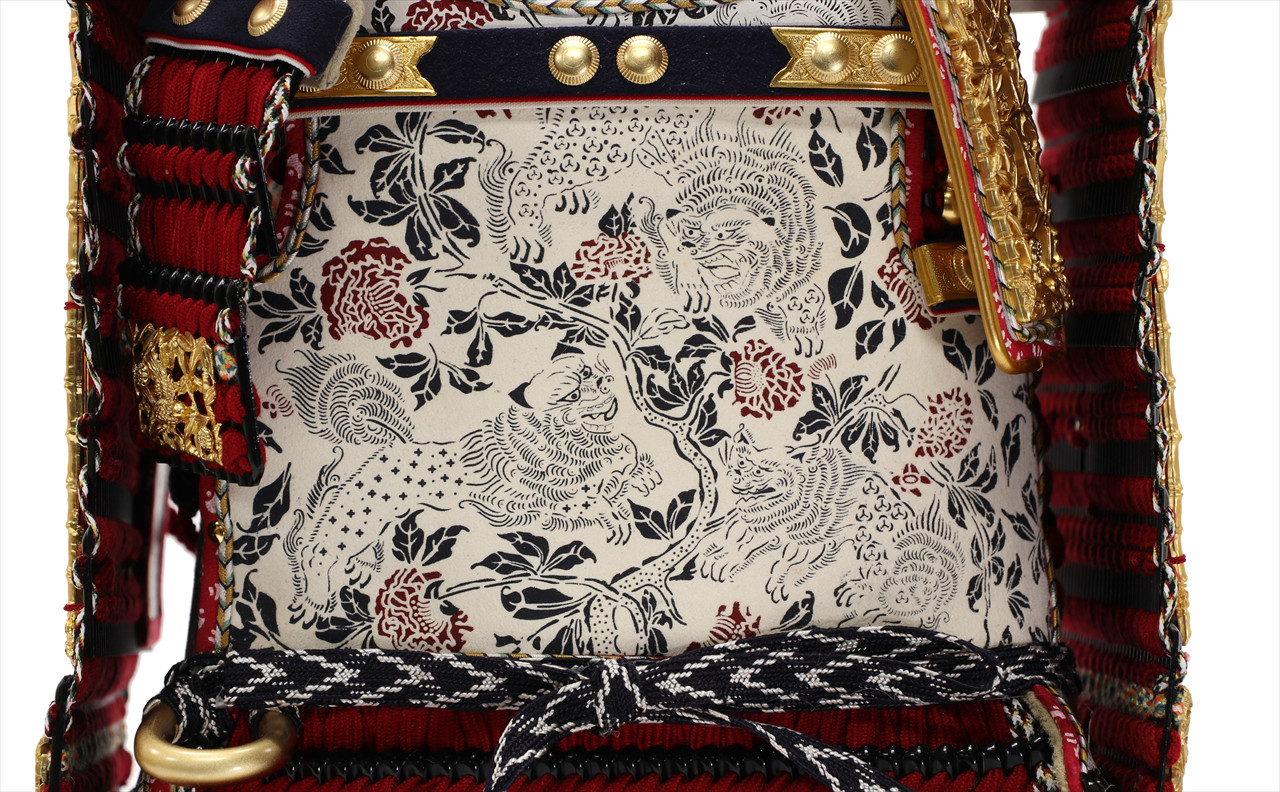 兜や鎧全身にある金物細工には隙間なく金箔押しが施され、無数の雀が戯れる様子が表現されています。