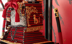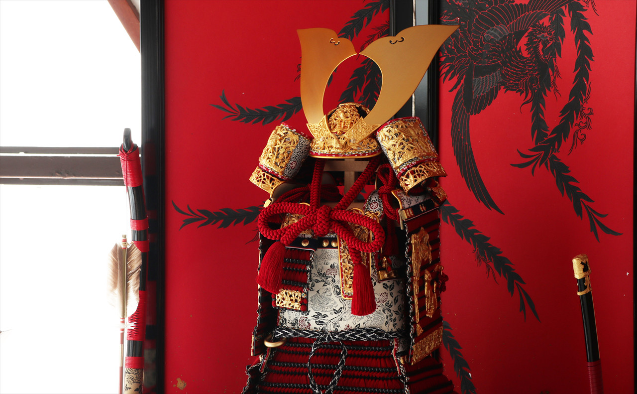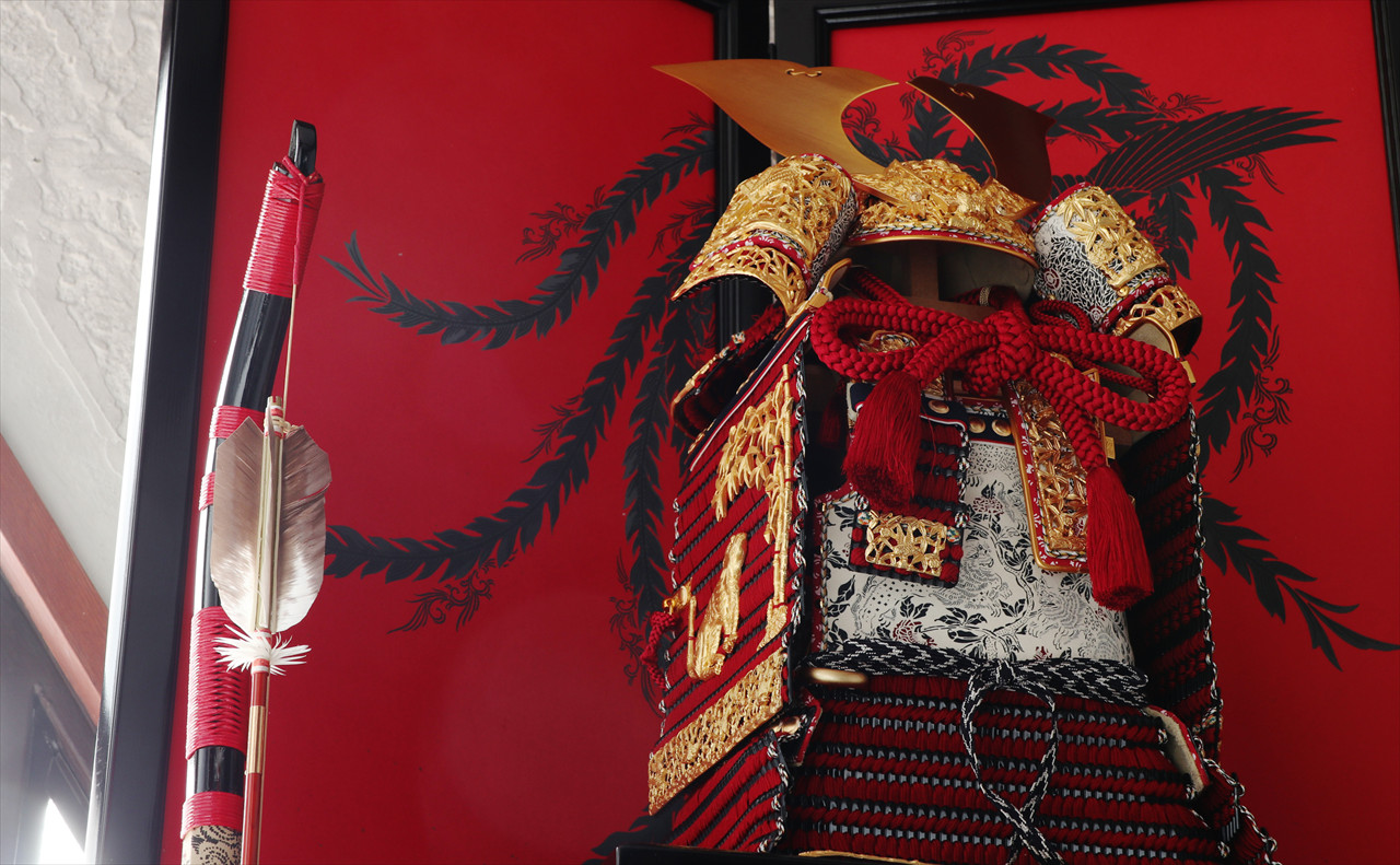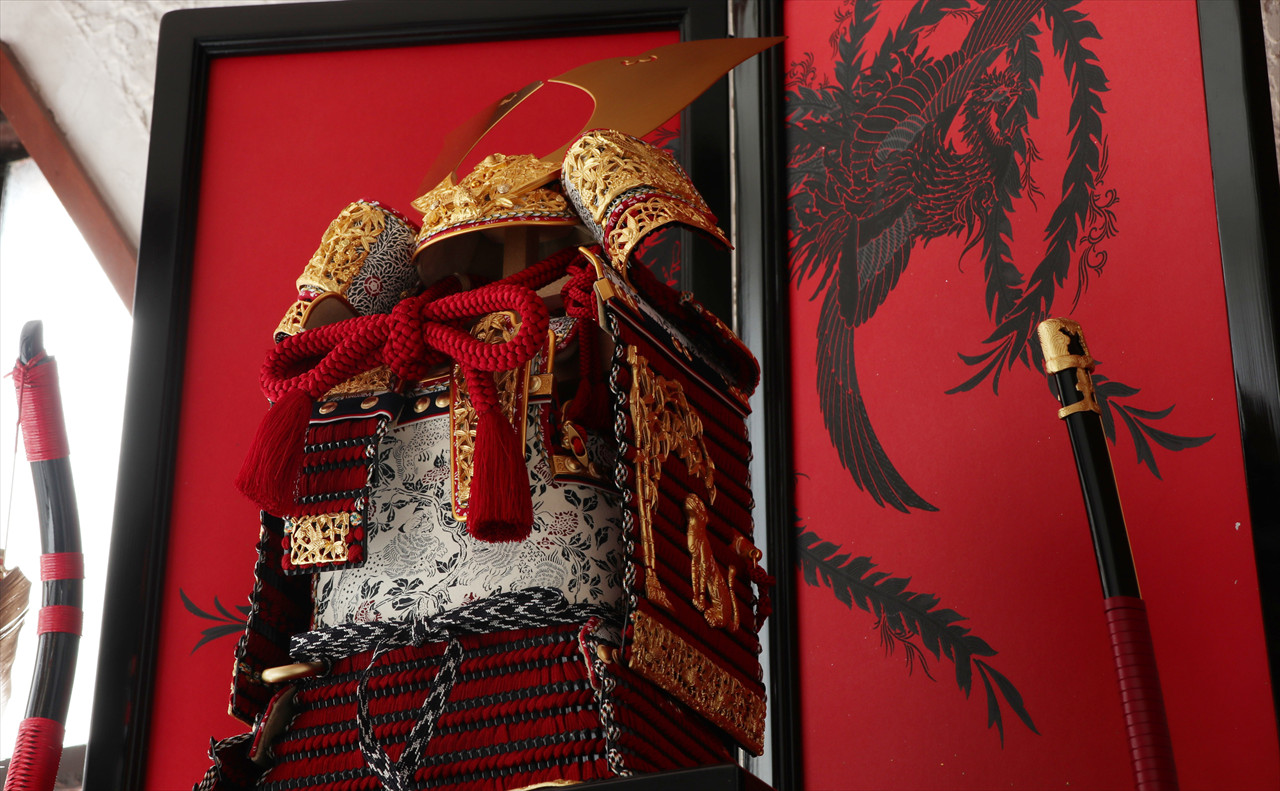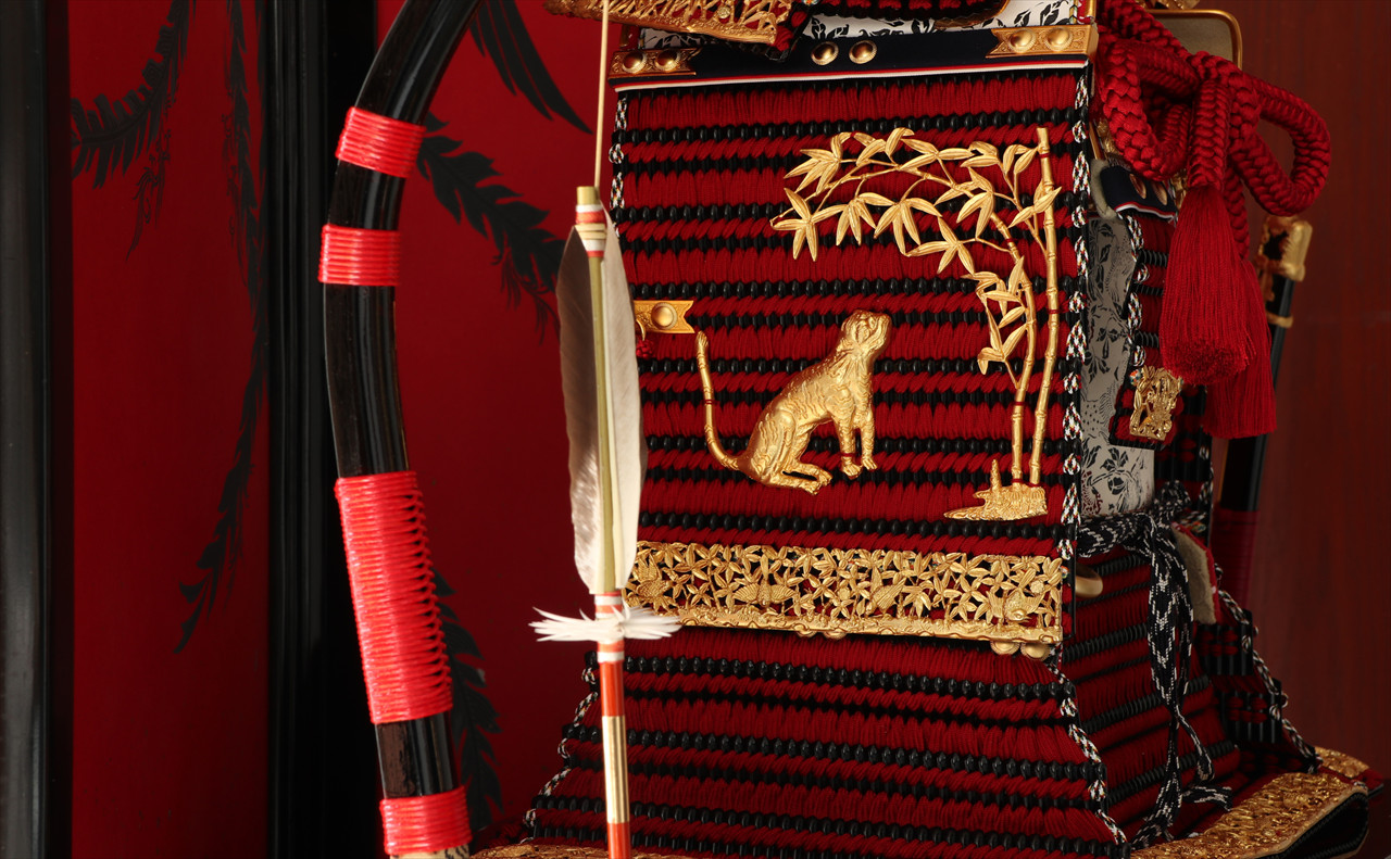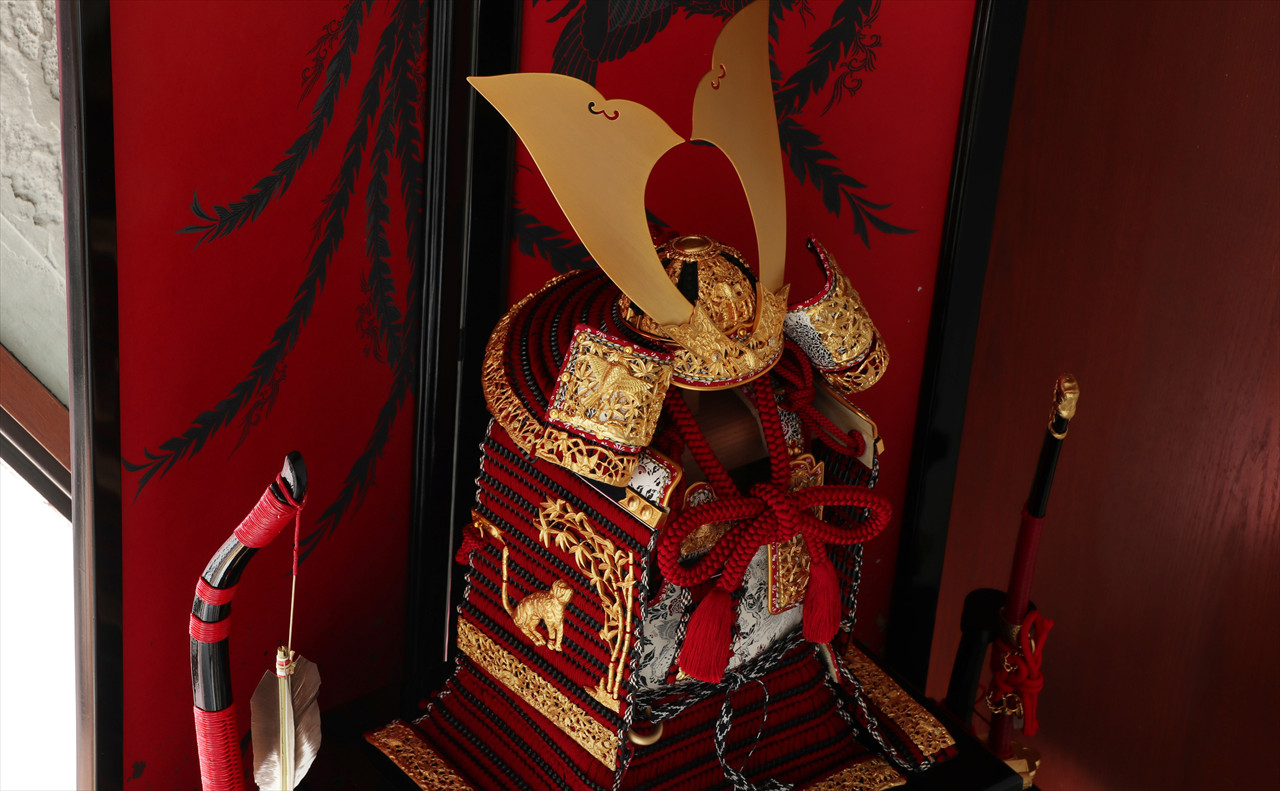 兜や鎧全身にある金物細工には隙間なく金箔押しが施され、無数の雀が戯れる様子が表現されています。