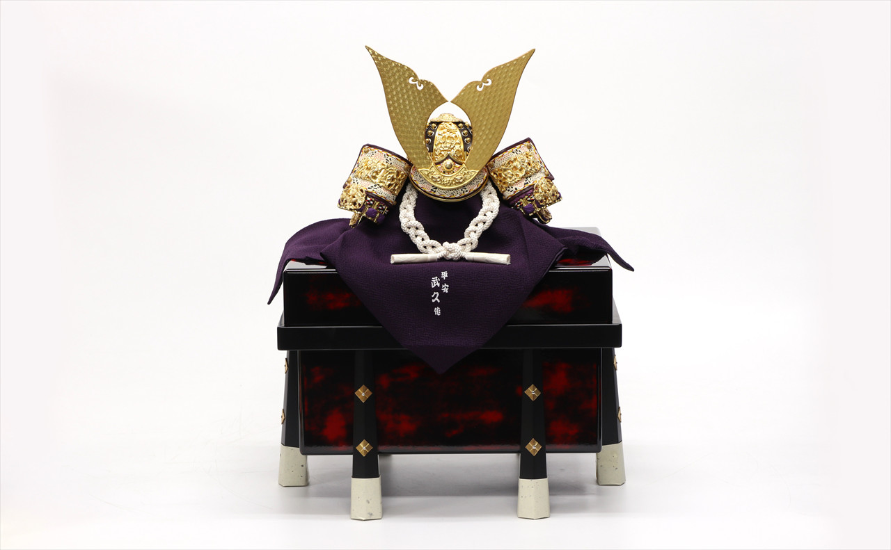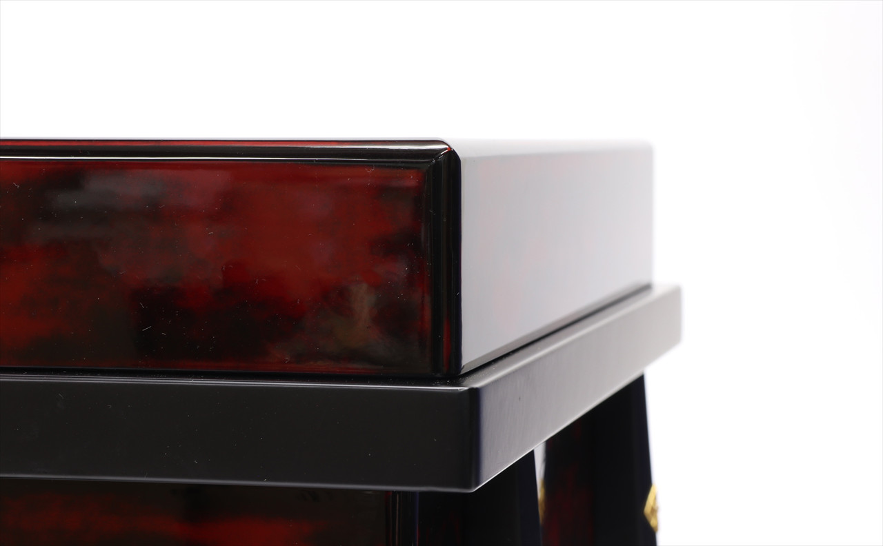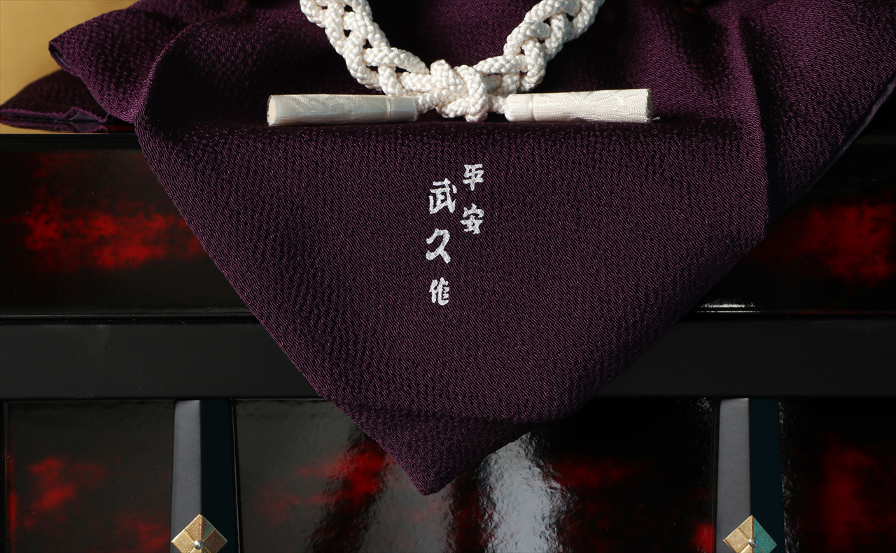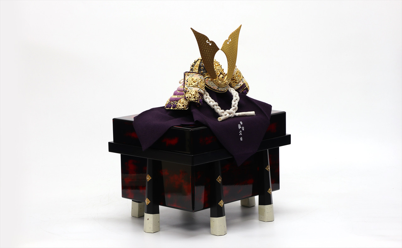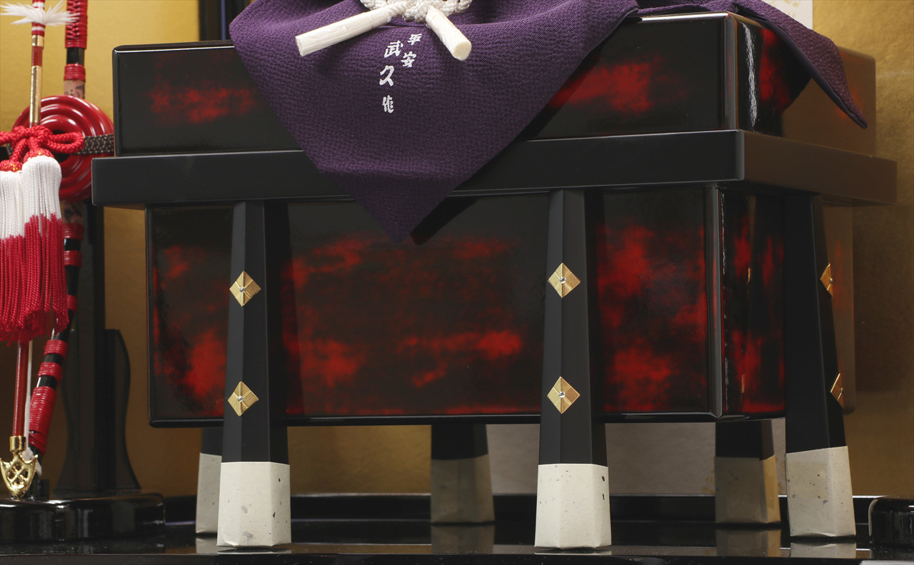 一般的な金具はプレス成形による大量生産です。そのため商品が違っても同じ飾り金具の五月人形はよくあります。 平安武久では「総裏」ランクの兜の櫃は、この「根来塗」で仕上げたものが使われます。下塗りに黒、上塗りに赤を塗り、赤の一部を研ぎだして黒地を出します。 研ぎ具合によって濃淡や模様が生まれ美しい色とデザインが表現されます。深い色合いは時とおもにより深く変化するともいわれ、総裏仕立ての兜によく合います。