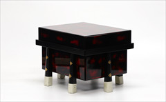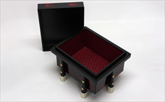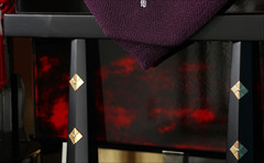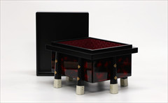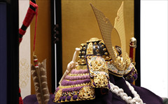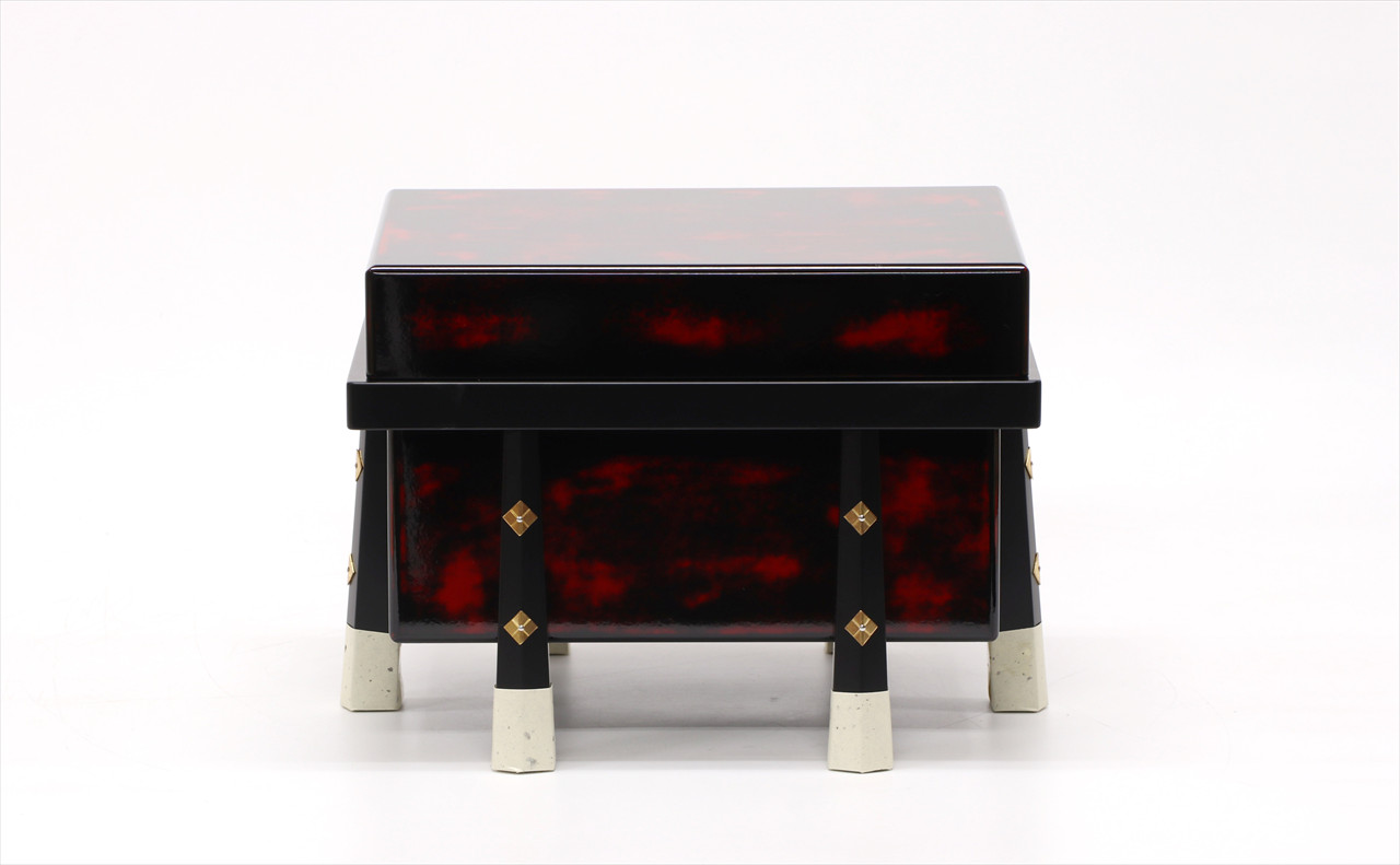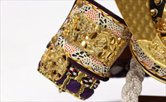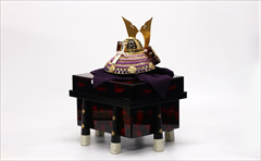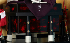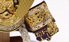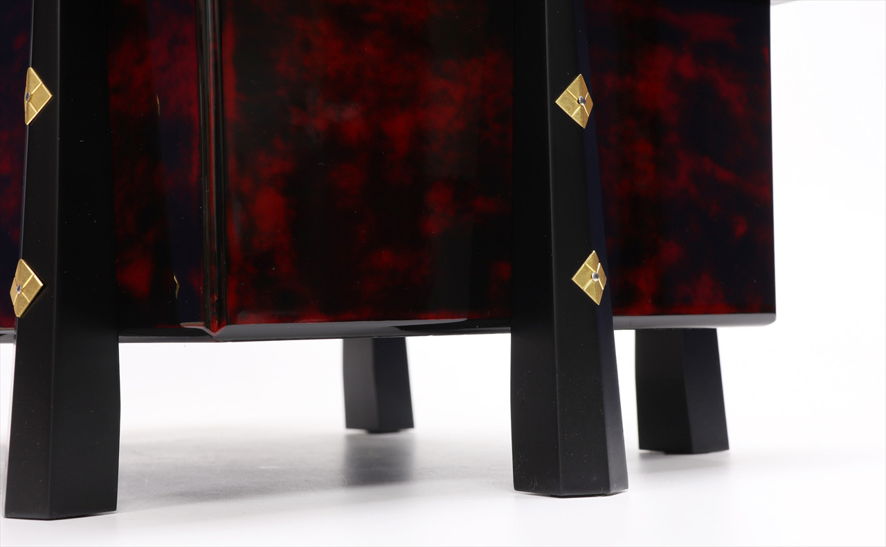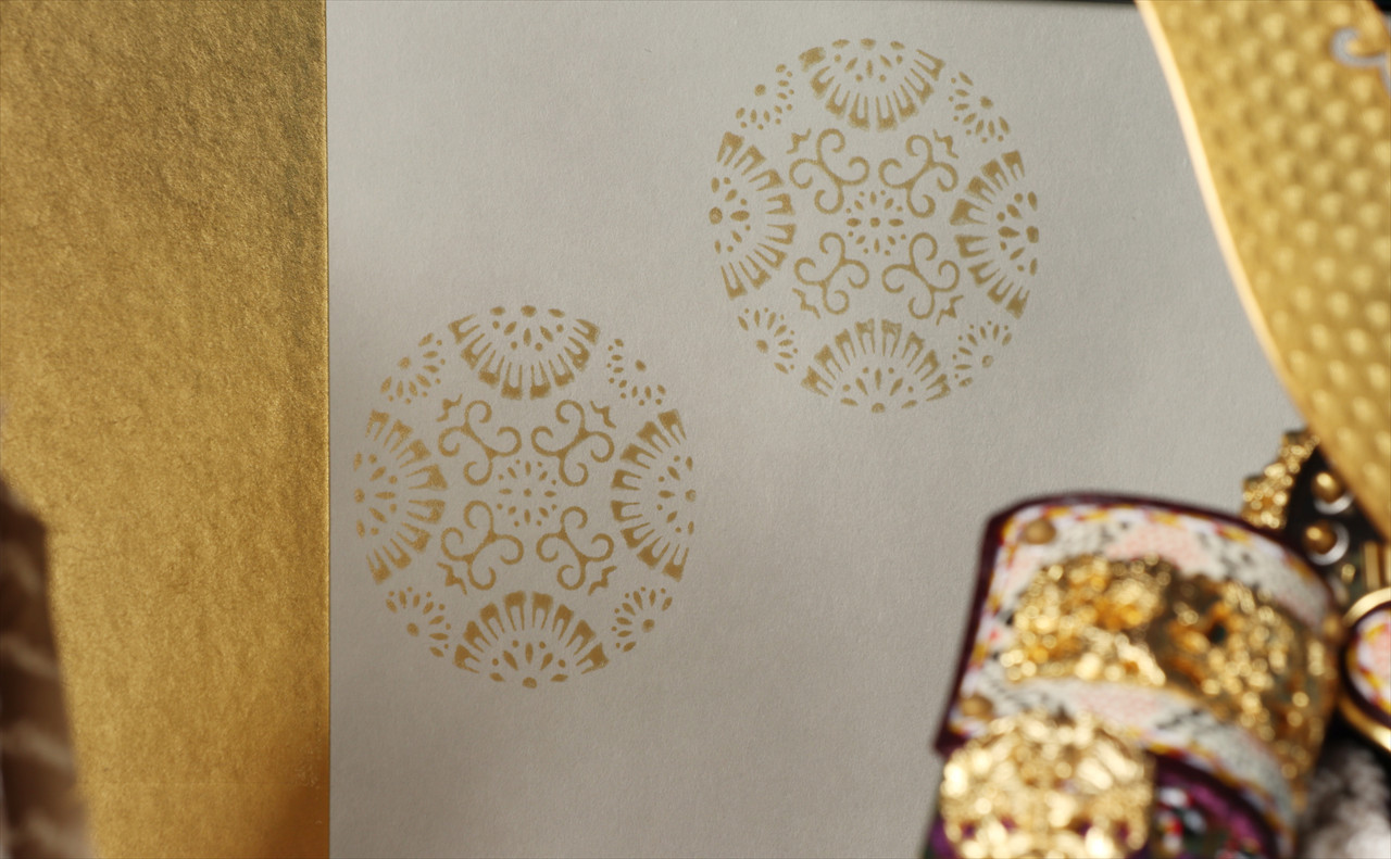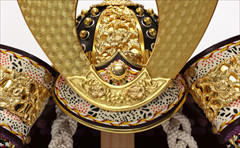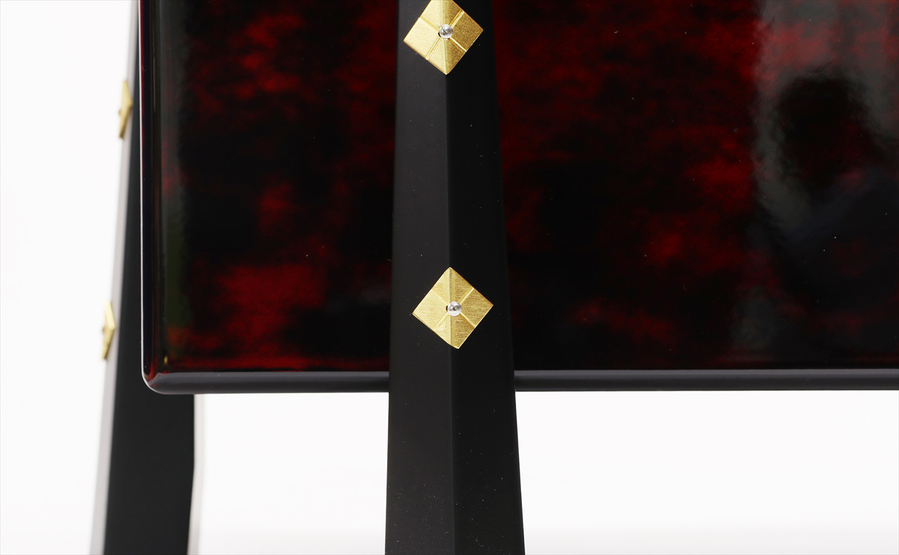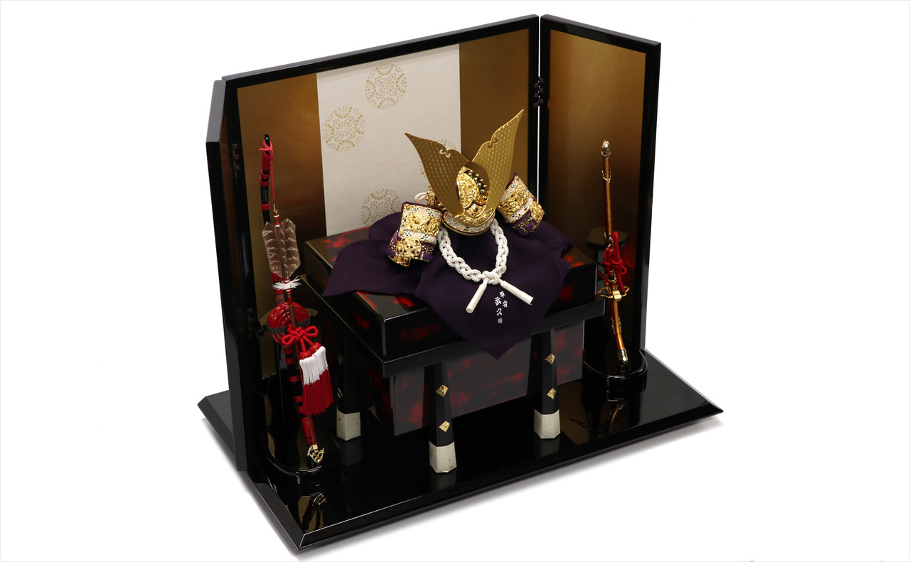 一般的な金具はプレス成形による大量生産です。そのため商品が違っても同じ飾り金具の五月人形はよくあります。 平安武久では「総裏」ランクの兜の櫃は、この「根来塗」で仕上げたものが使われます。下塗りに黒、上塗りに赤を塗り、赤の一部を研ぎだして黒地を出します。 研ぎ具合によって濃淡や模様が生まれ美しい色とデザインが表現されます。深い色合いは時とおもにより深く変化するともいわれ、総裏仕立ての兜によく合います。