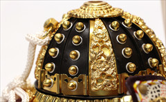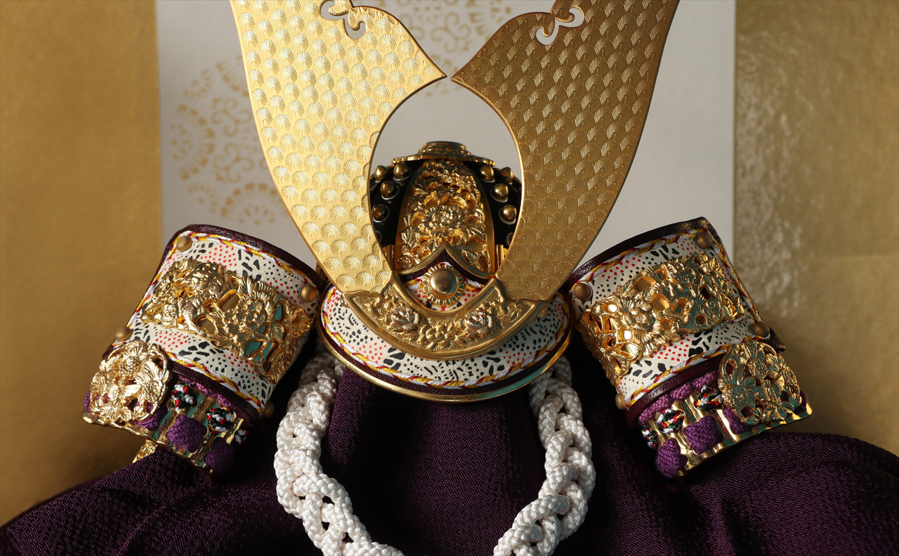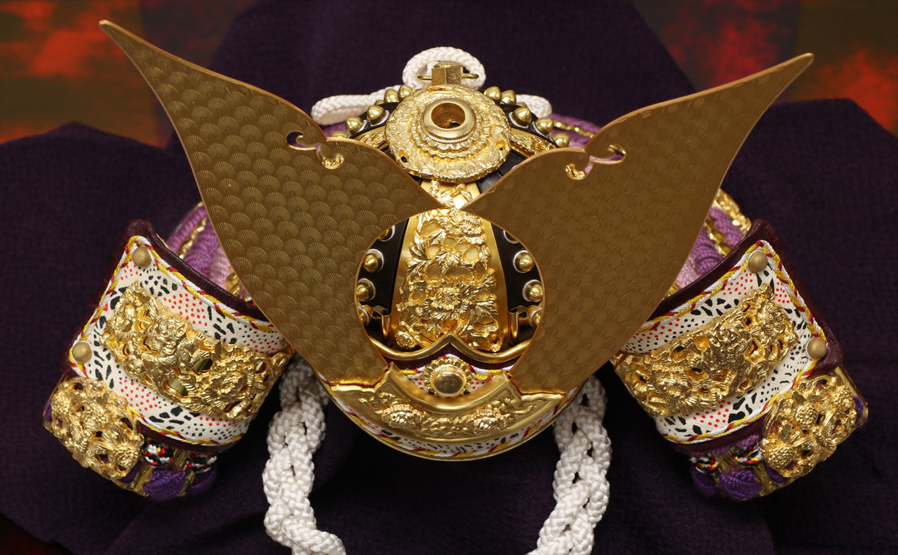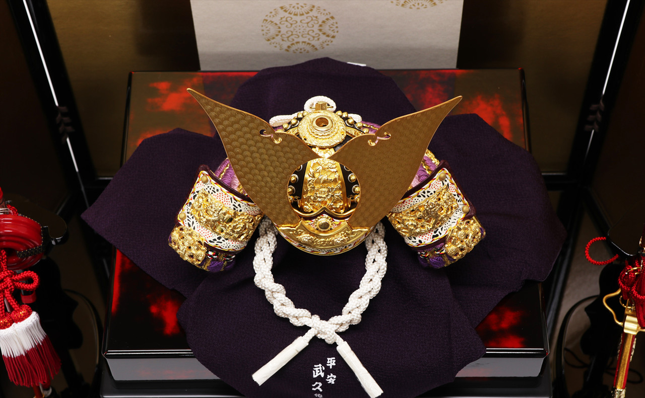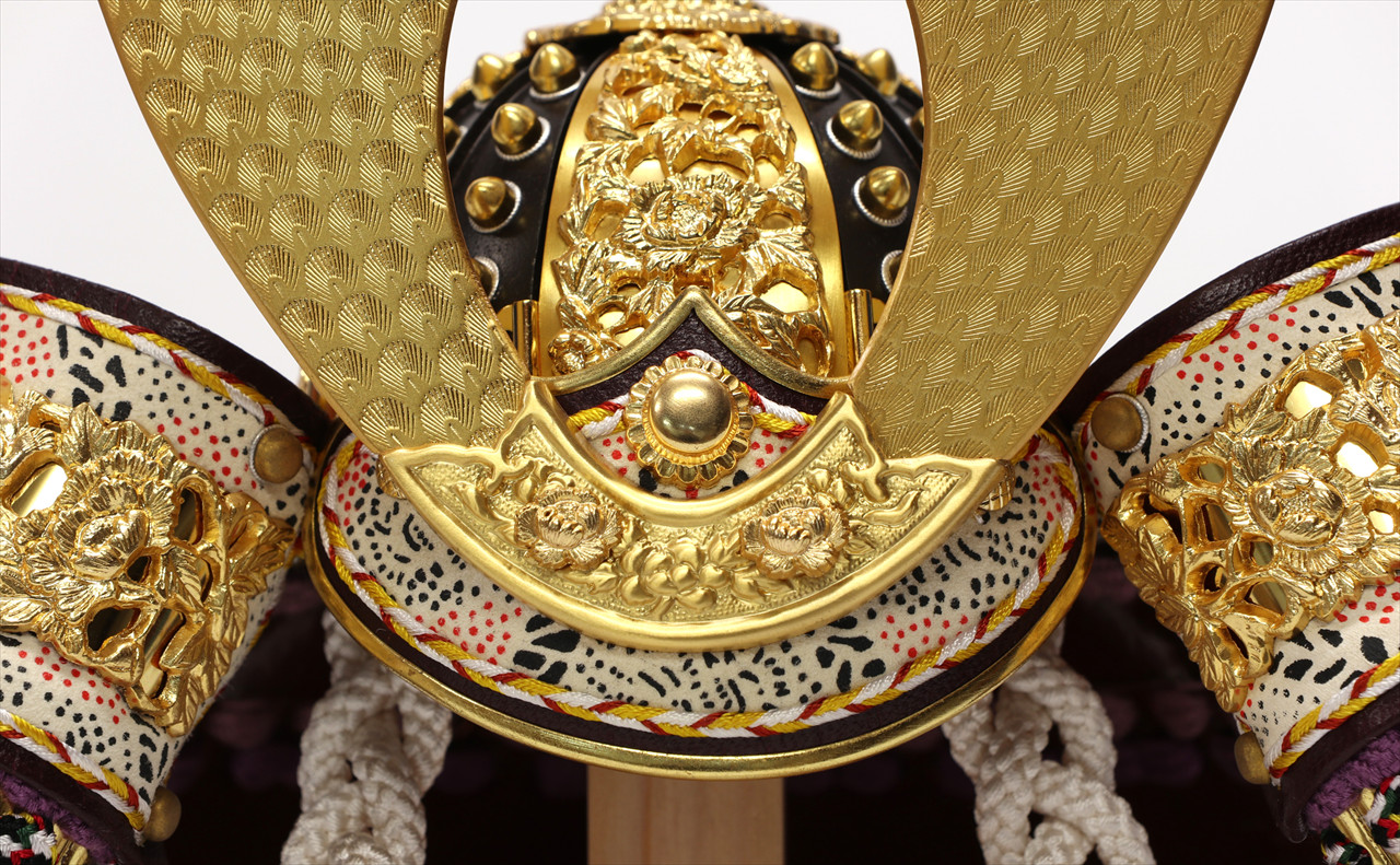 一般的な金具はプレス成形による大量生産です。そのため商品が違っても同じ飾り金具の五月人形はよくあります。 しかし、総裏のそれは電鋳加工で作られた金具が使われます。電鋳加工は専門的な用語・製法ですが、複雑な形状や精度が要求されるものを成形する技術であり、 武久の甲冑の金具のように細かく微細な形状を実現します。品質は高いのですがコストも相応にかかるため総裏のような一部の甲冑にのみ使用されます。