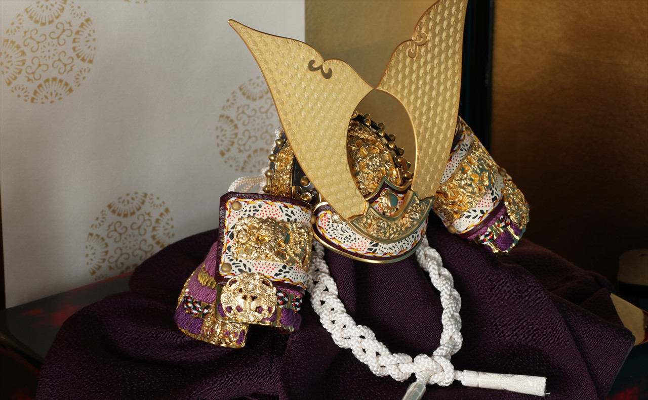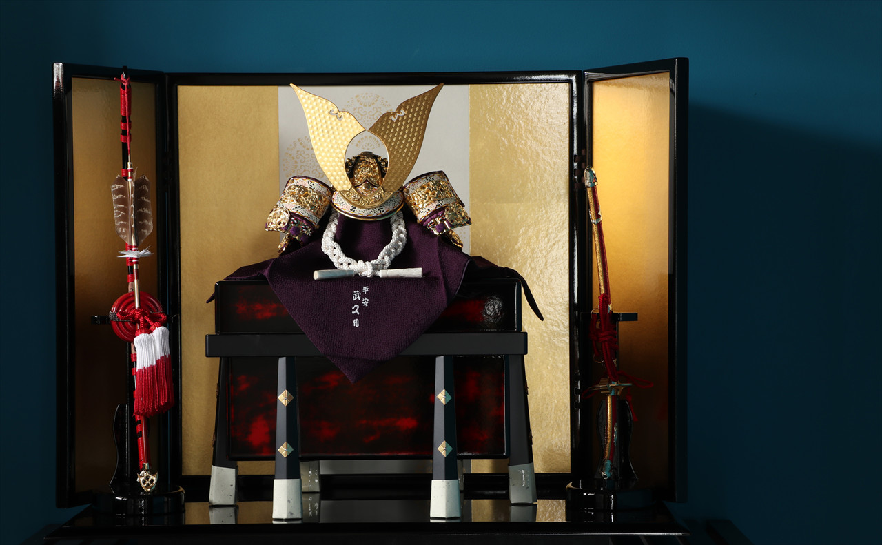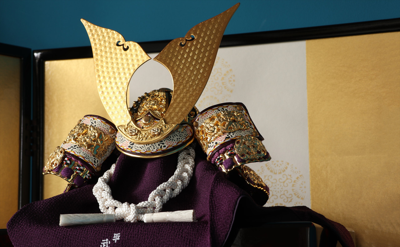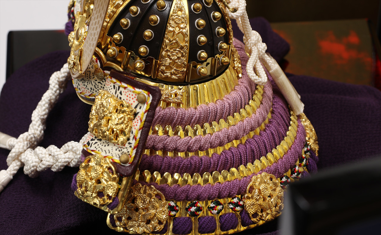 一般的な金具はプレス成形による大量生産です。そのため商品が違っても同じ飾り金具の五月人形はよくあります。 しかし、総裏のそれは電鋳加工で作られた金具が使われます。電鋳加工は専門的な用語・製法ですが、複雑な形状や精度が要求されるものを成形する技術であり、 武久の甲冑の金具のように細かく微細な形状を実現します。品質は高いのですがコストも相応にかかるため総裏のような一部の甲冑にのみ使用されます。