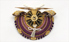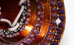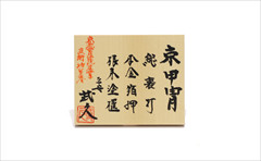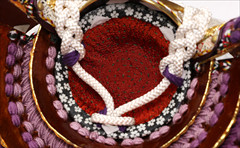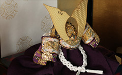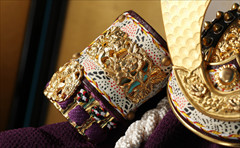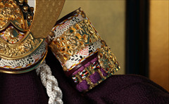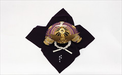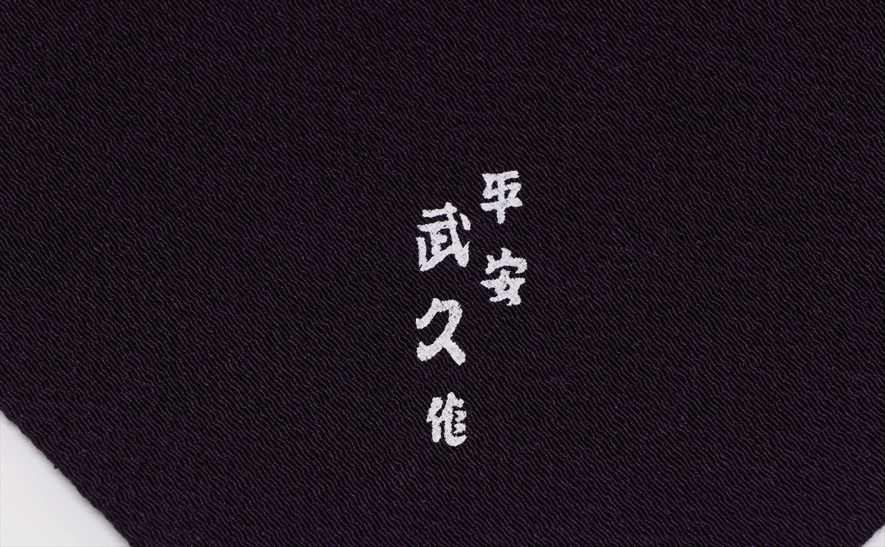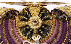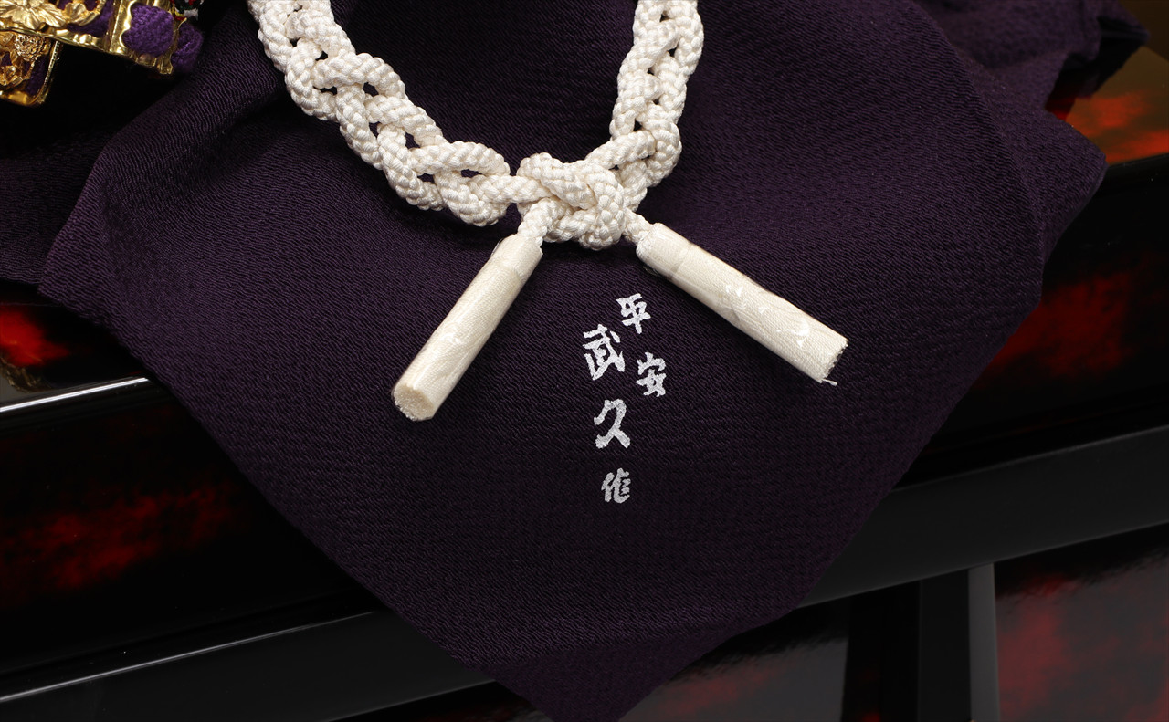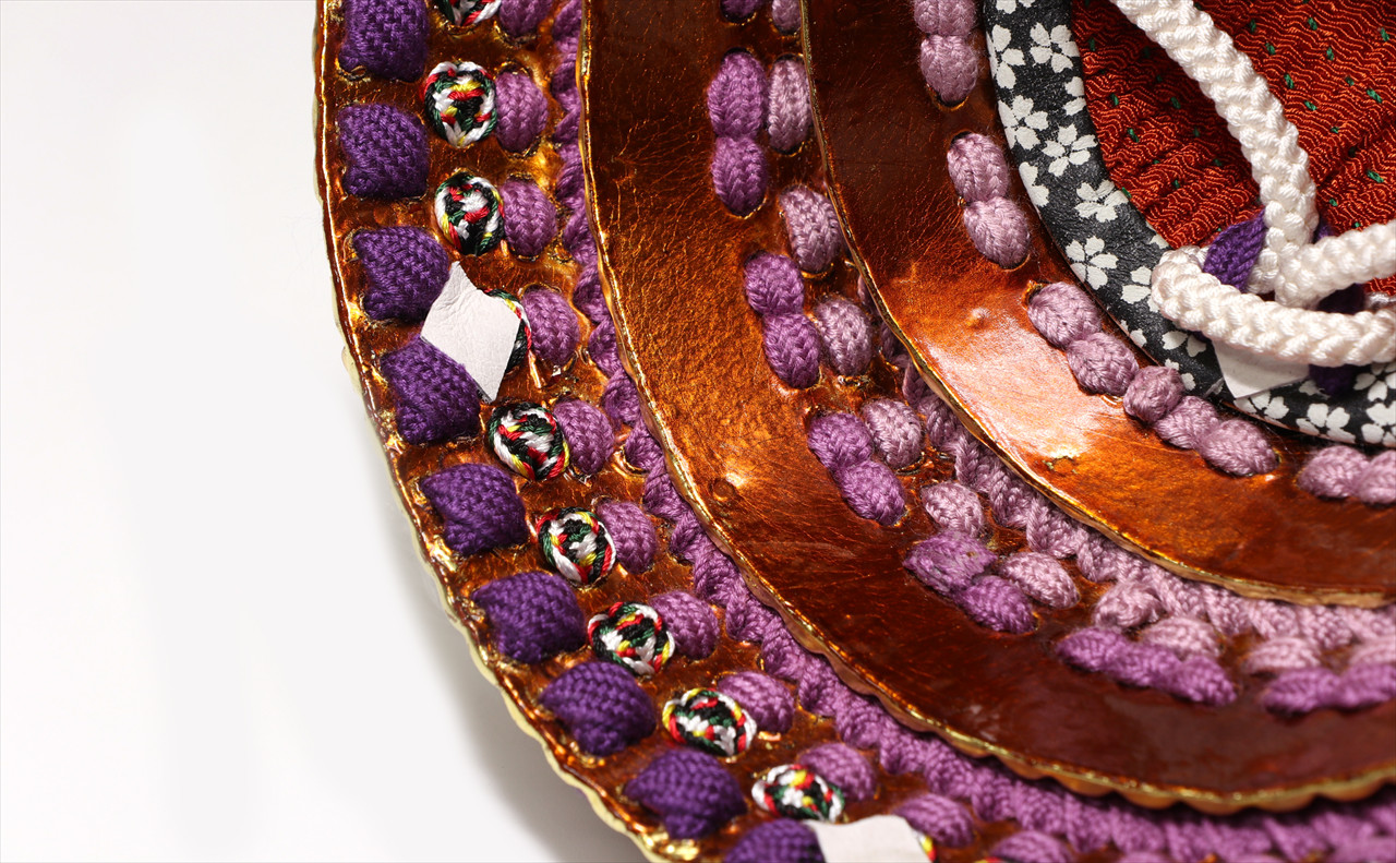 そのほか、平安武久の兜では、小札表面には本金箔を貼り、飾り金具には全て本金鍍金を施し、兜の鉢の内部には刺し子を施し、その頭裏の刺し子内部には白檀香を忍ばせます。 金箔や鍍金は御祝いにふさわしい雅な美しさとして、頭裏の刺し子は補強のための伝統手芸、白檀香は高貴な香りとともに防虫効果として。