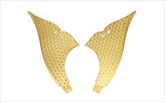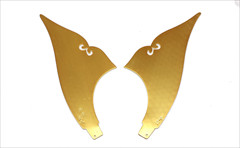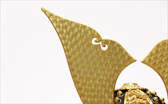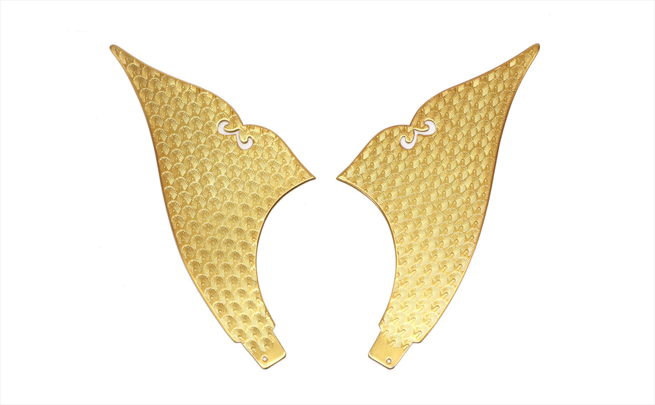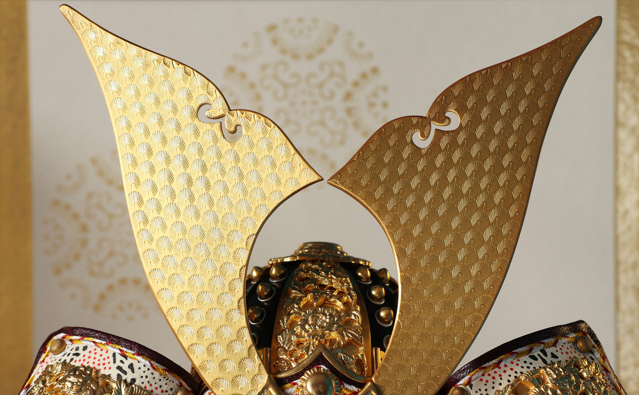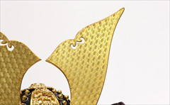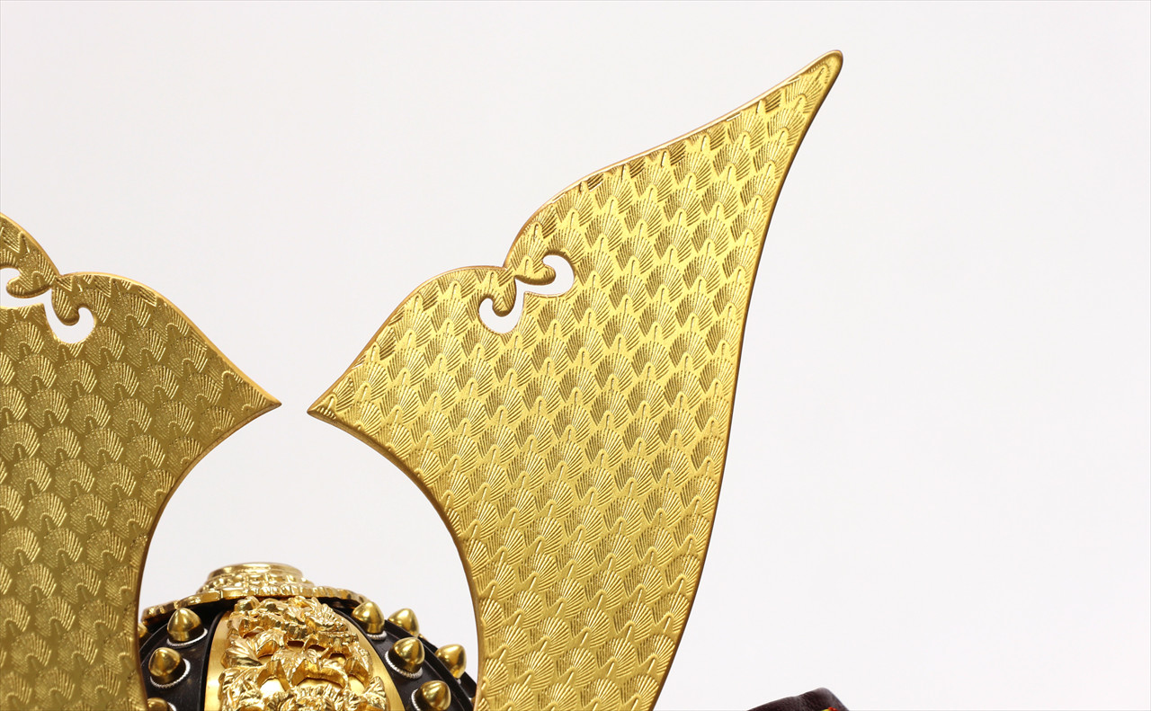 総裏と呼ばれる兜の鍬形は、手切りで切り出し面取りされた物が使われます。また、鳥の羽のような模様は、一つ一つを鏨で手打ちし曲線にそって打ち込まれます。 これにより、鍬形の曲線にそって模様が整列した作りになります。これに本金鍍金をすることで鈍い光沢が生まれます。