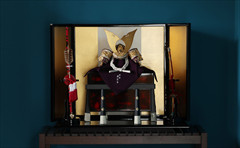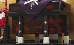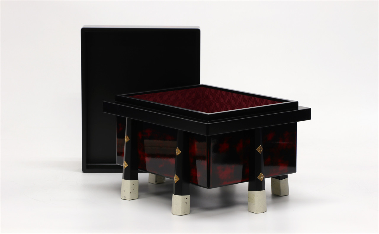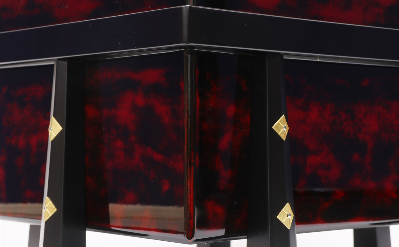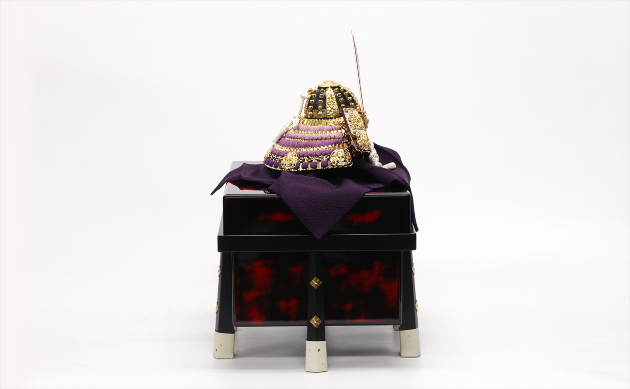 根来塗の赤黒く光沢のある櫃を台座に、浮かぶように飾られる京甲冑の最高峰である総裏の兜。その姿を余すことなくご覧ください。