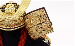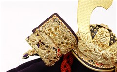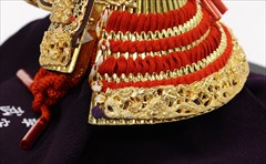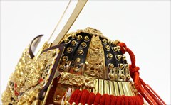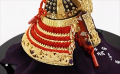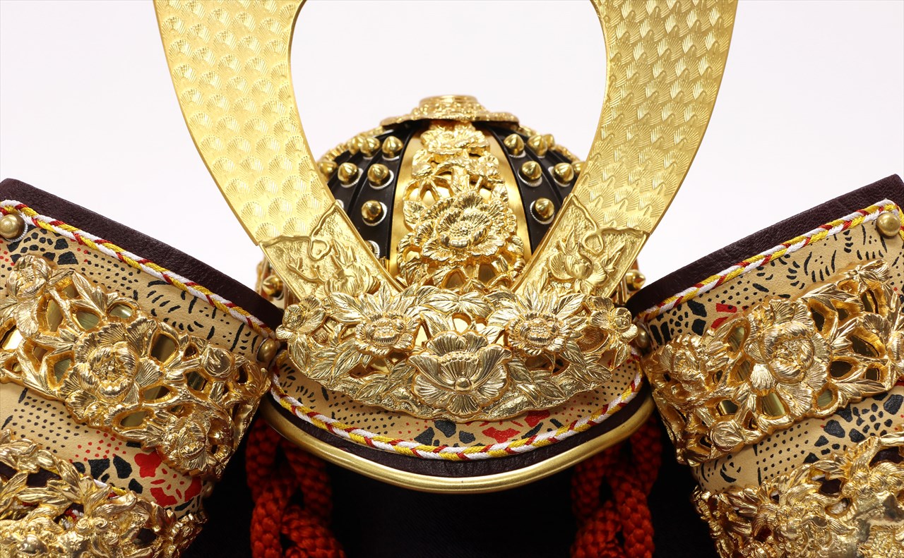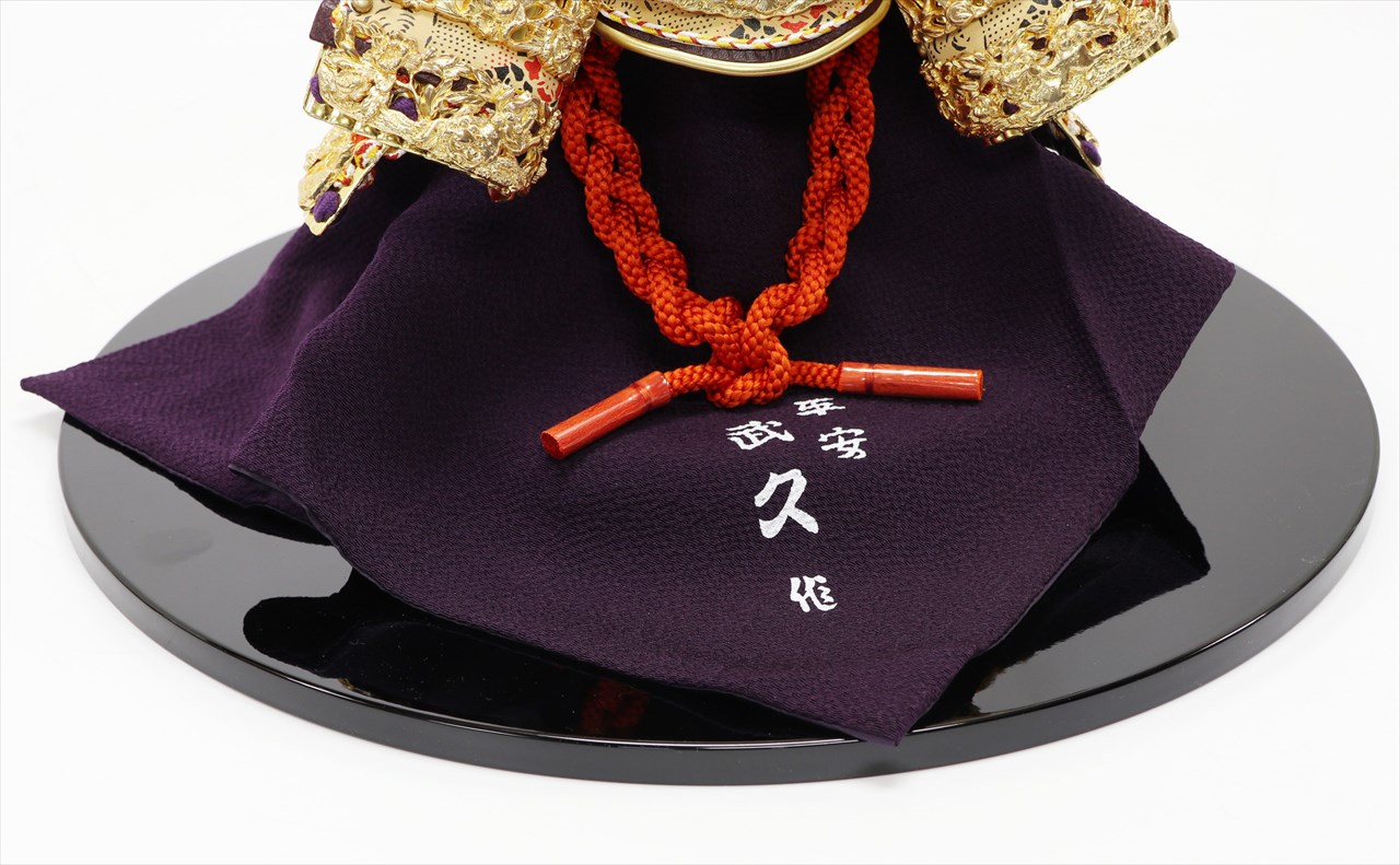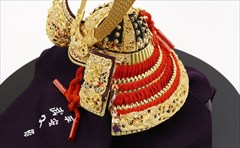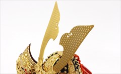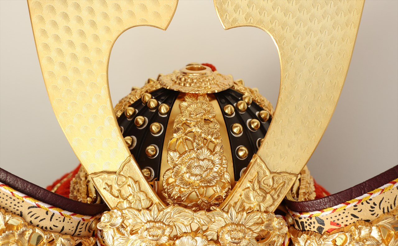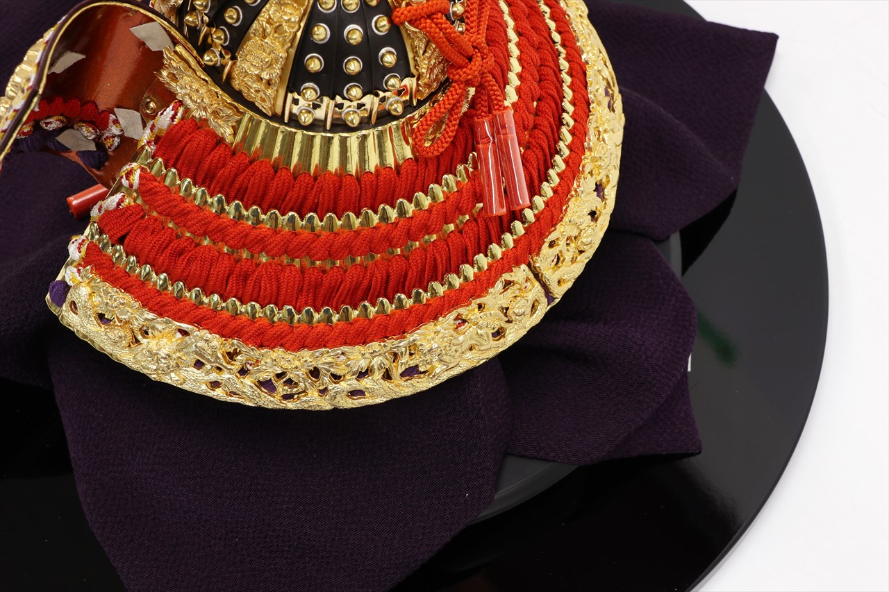 兜の裏面、小札と呼ばれる横一列の湾曲した部品は、表からみると小さな札が並べられ結ばれています。その一方、裏から見るとデコボコと波打って成形されているのが通常の小札です。「総裏打ち」はこの凸凹と波打った状態をこの写真のように平らに美しく加工する技術です。平安武久では、このでこぼこが平らになるように和紙を貼り重ね慣らします。そしてその和紙に本金箔を貼り付け、その上に漆塗りを施していきます。 漆が下の金箔の色と光をある程度透過することで「白檀塗」と同じように飴色に輝きますが、これを「裏打ち」と言います。「総」裏打ちは、全ての小札板に対し裏打ち処理を施すことをさします。