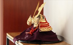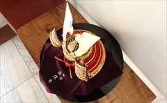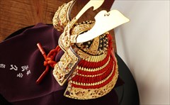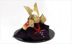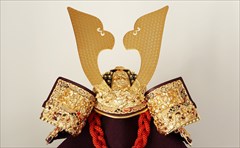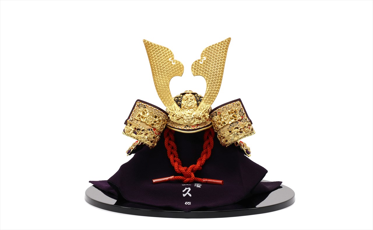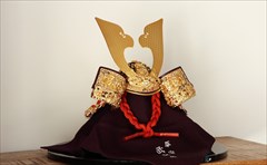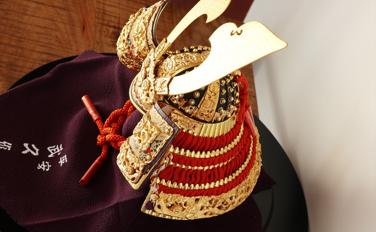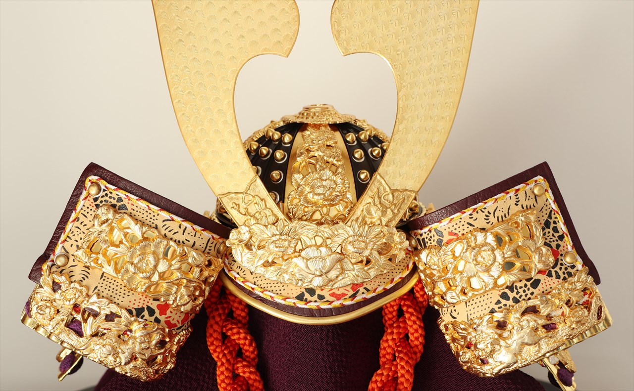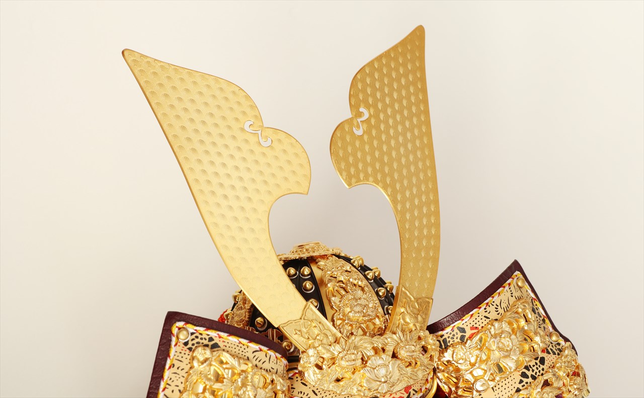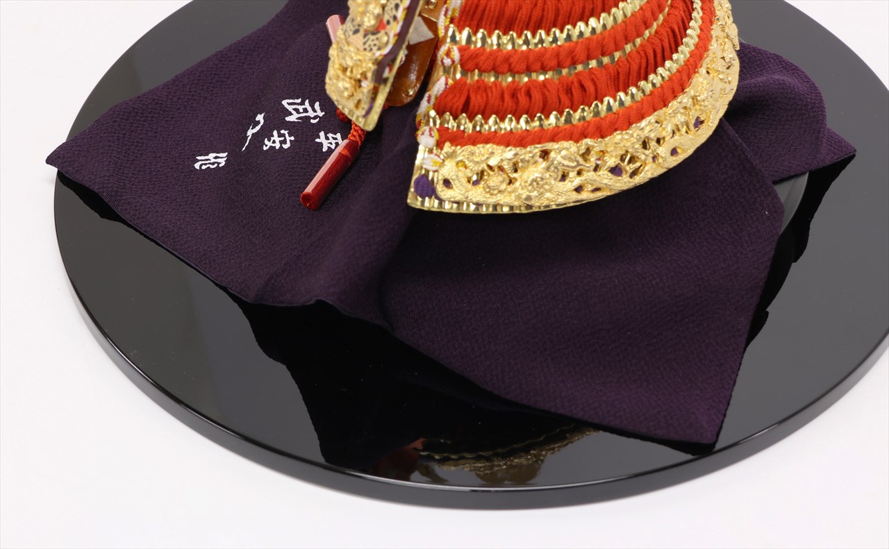 兜の裏面、小札と呼ばれる横一列の湾曲した部品は、表からみると小さな札が並べられ結ばれています。その一方、裏から見るとデコボコと波打って成形されているのが通常の小札です。「総裏打ち」はこの凸凹と波打った状態をこの写真のように平らに美しく加工する技術です。平安武久では、このでこぼこが平らになるように和紙を貼り重ね慣らします。そしてその和紙に本金箔を貼り付け、その上に漆塗りを施していきます。 漆が下の金箔の色と光をある程度透過することで「白檀塗」と同じように飴色に輝きますが、これを「裏打ち」と言います。「総」裏打ちは、全ての小札板に対し裏打ち処理を施すことをさします。